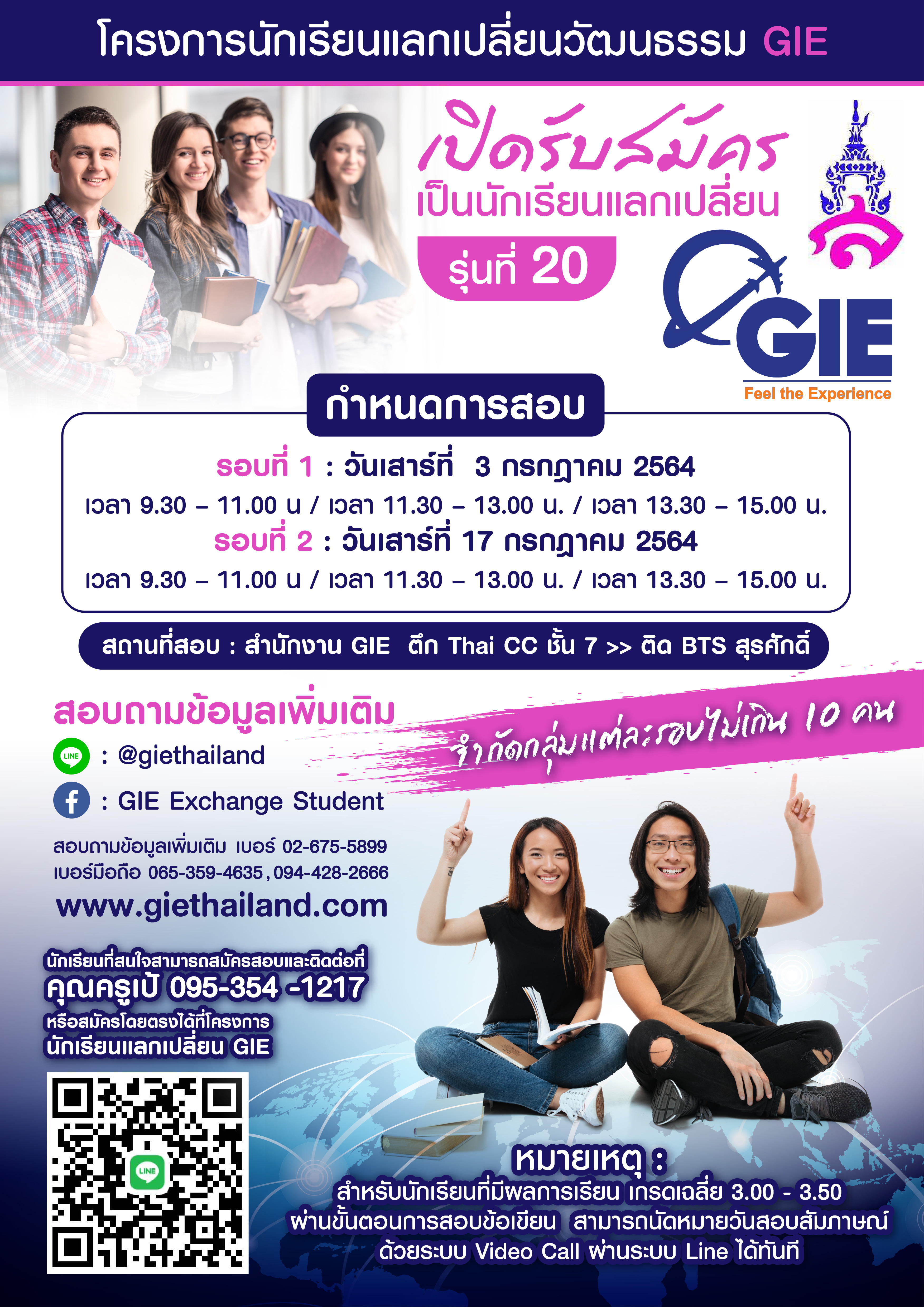 เปิดรับสมัครแล้ว โครงการนักเรียนแลกเปลี่ยน GIE  ระยะยาว 1 ปี เดินทางปี 2565  ประเทศที่เปิดรับสมัคร  สหรัฐอเมริกา, แคนาดา,จีน, เยอรมนี, อิตาลี, ฝรั่งเศส, ฟินแลนด์,เบลเยียม, สเปน