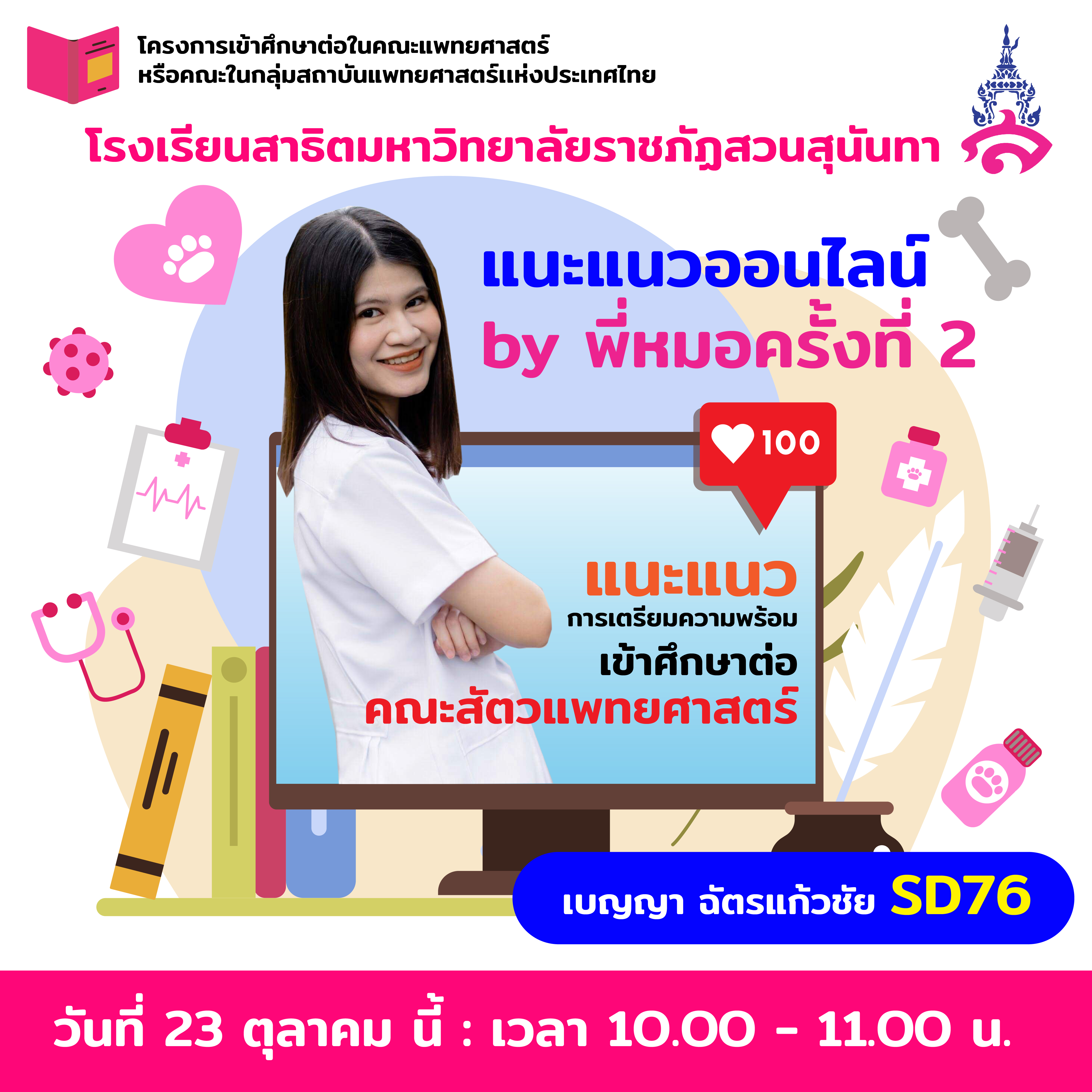 วันที่ 23 ตค. 64 นี้ เวลา 10.00-11.00 น. อาจารย์ ดร.ภาวิณี รัตนคอน ได้จัดให้มีแนะแนวออนไลน์กับนักเรียนชั้นมัธยมศึกษาตอนปลายโรงเรียนสาธิตสวนสุนันทา โดยนางสาวเบญญา ฉัตรแก้วชัย ศิษย์เก่าโรงเรียนสาธิตสวนสุนันทา (SD76) ที่กำลังศึกษาคณะสัตวแพทย์ ปี 6 มหาวิทยาลัยเกษตรศาสตร์ ผู้สนใจทั้ง ep และ gep เข้าร่วมกลุ่มออนไลน์ได้ที่ลิงก์นี้