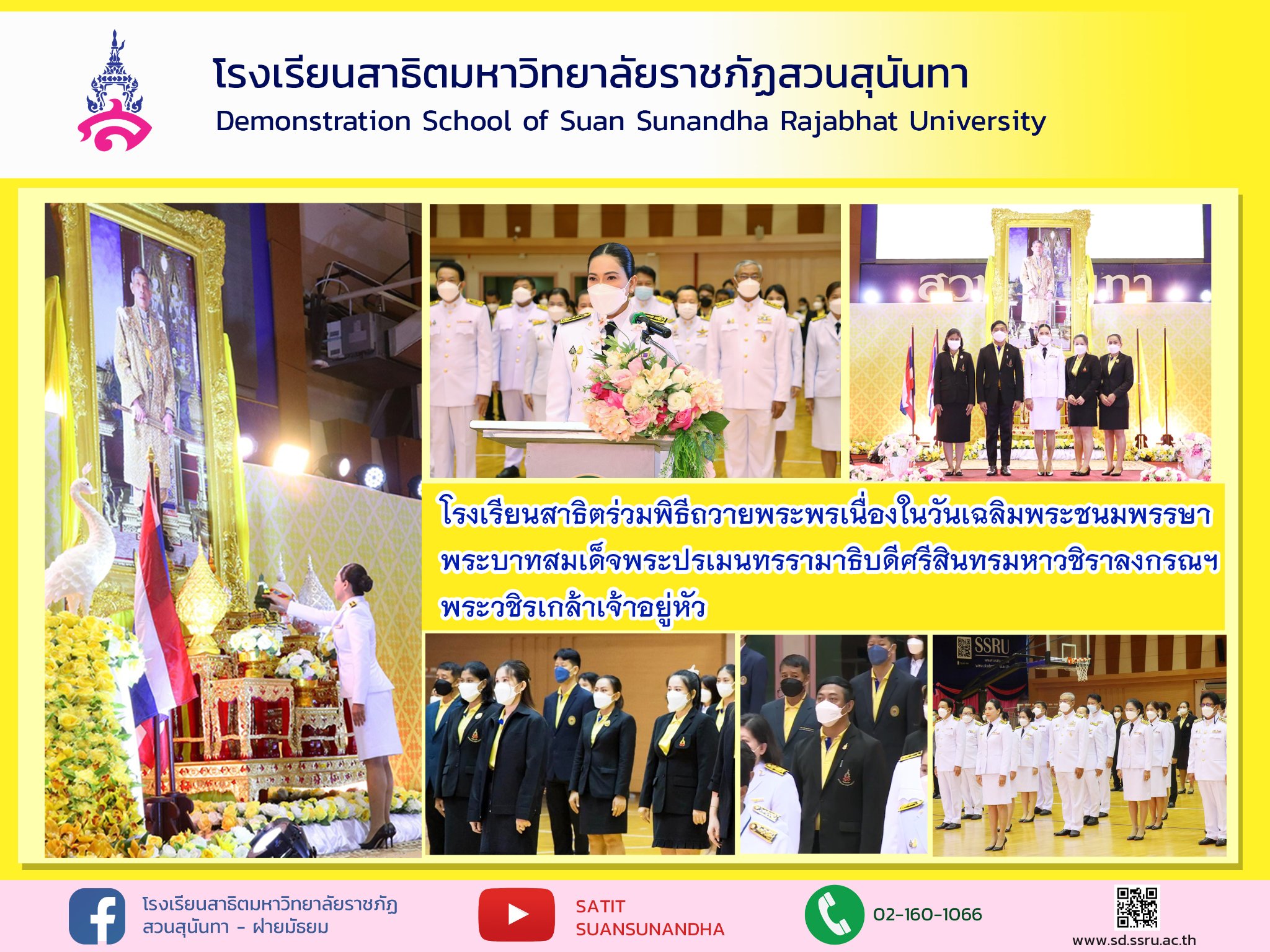 27 July 2022 Demonstration School Suan Sunandha Rajabhat University, led by Assoc. Academic Department, English Program and school personnel Attending the Blessing Ceremony on the occasion of His Majesty the King's BirthdayHis Majesty King Bhumibol Adulyadej Phra Wachiraklao Chao Yuhua and the oath of allegiance ceremony to be a good official and the power of the land by Associate Professor Dr. Chutikarn Sriwiboon, President, presided over the ceremony. along with the university administration Join the blessing of the auspicious In front of the royal portrait and oath of allegiance at Suan Sunandha Health and Sports Center Building, 4th floor