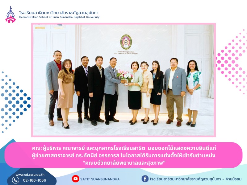 On July 10, 2023, Demonstration School Suan Sunandha Rajabhat University, led by Associate Professor Dr. Somkiat Korbua Kaew, the school's director. Leading the management team, faculty and staff to give flowers to congratulate Assistant Professor Dr. Tassanee Attharos on the occasion of being appointed to the position "Dean of the College of Nursing and Health"