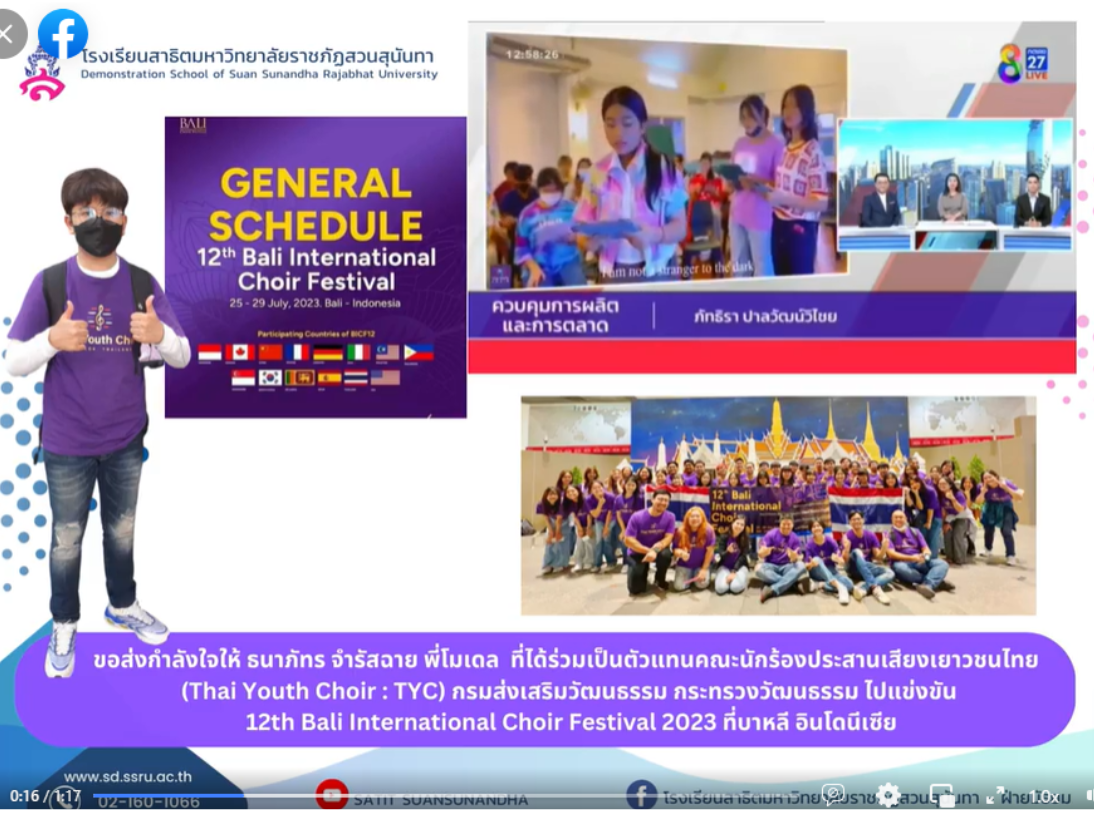 Sending encouragement to Thanapat Jumraschai. Grade 5/2 English Program Suan Sunandha Rajabhat University Demonstration School represented Thai Youth Choir (TYC), Department of Cultural Promotion Ministry of Culture to compete in 12th Bali International Choir Festival 2023 in Bali, Indonesia