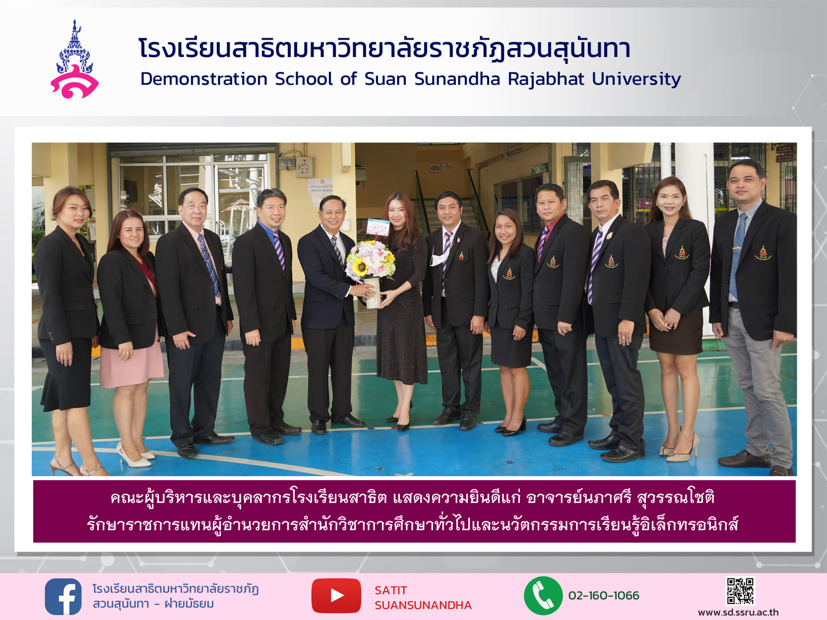 คณะผู้บริหารและบุคลากรโรงเรียนสาธิต แสดงความยินดีแก่ อาจารย์นภาศรี สุวรรณโชติ รักษาราชการแทนผู้อำนวยการสำนักวิชาการศึกษาทั่วไปและนวัตกรรมการเรียนรู้อิเล็กทรอนิกส์ มหาวิทยาลัยราชภัฏสวนสุนันทา