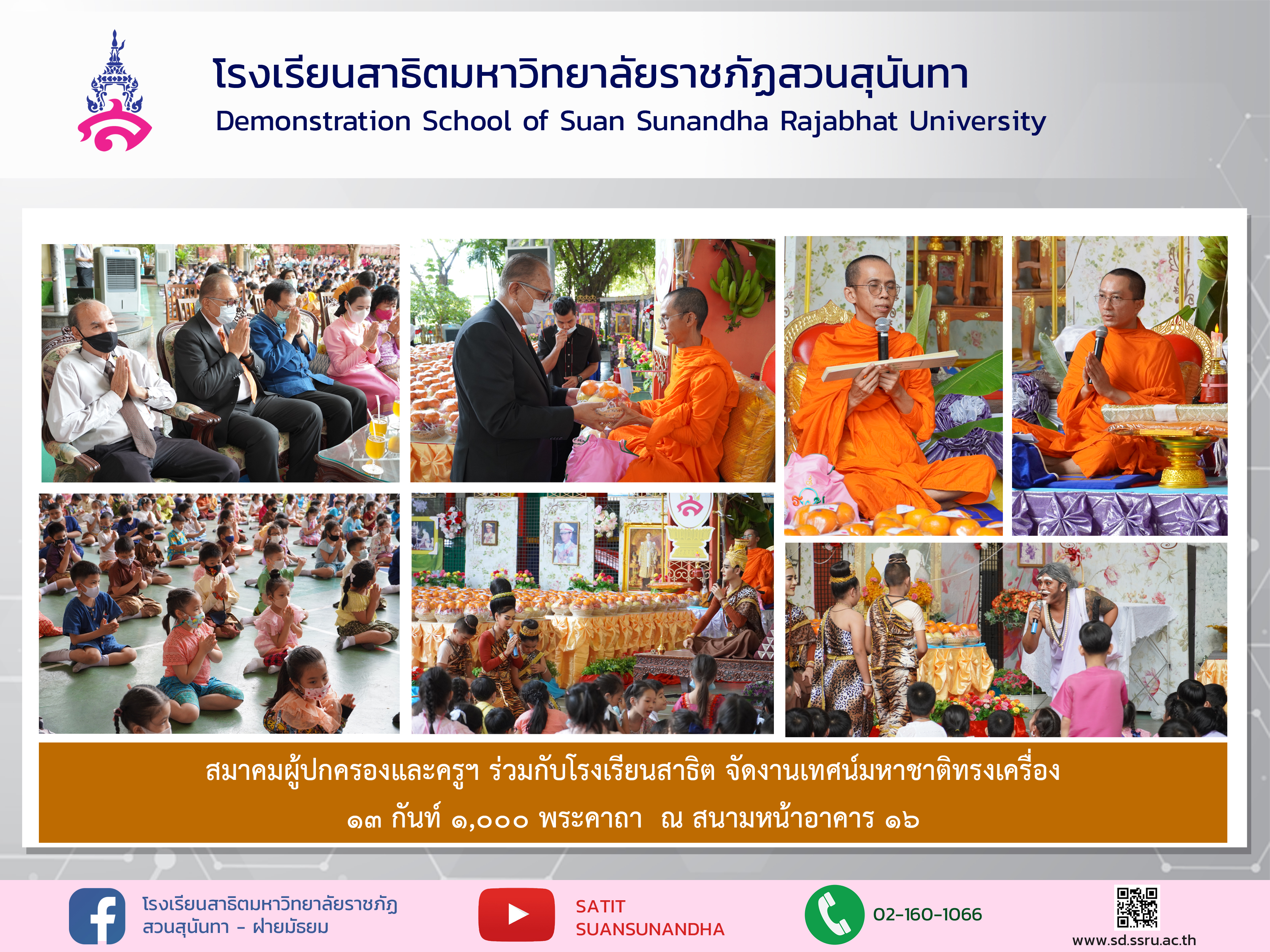 สมาคมผู้ปกครองและครูโรงเรียนสาธิตมหาวิทยาลัยราชภัฏสวนสุนันทา ร่วมกับ โรงเรียนสาธิต จัดงานเทศน์มหาชาติทรงเครื่อง ๑๓ กันท์ ๑,๐๐๐ พระคาถา