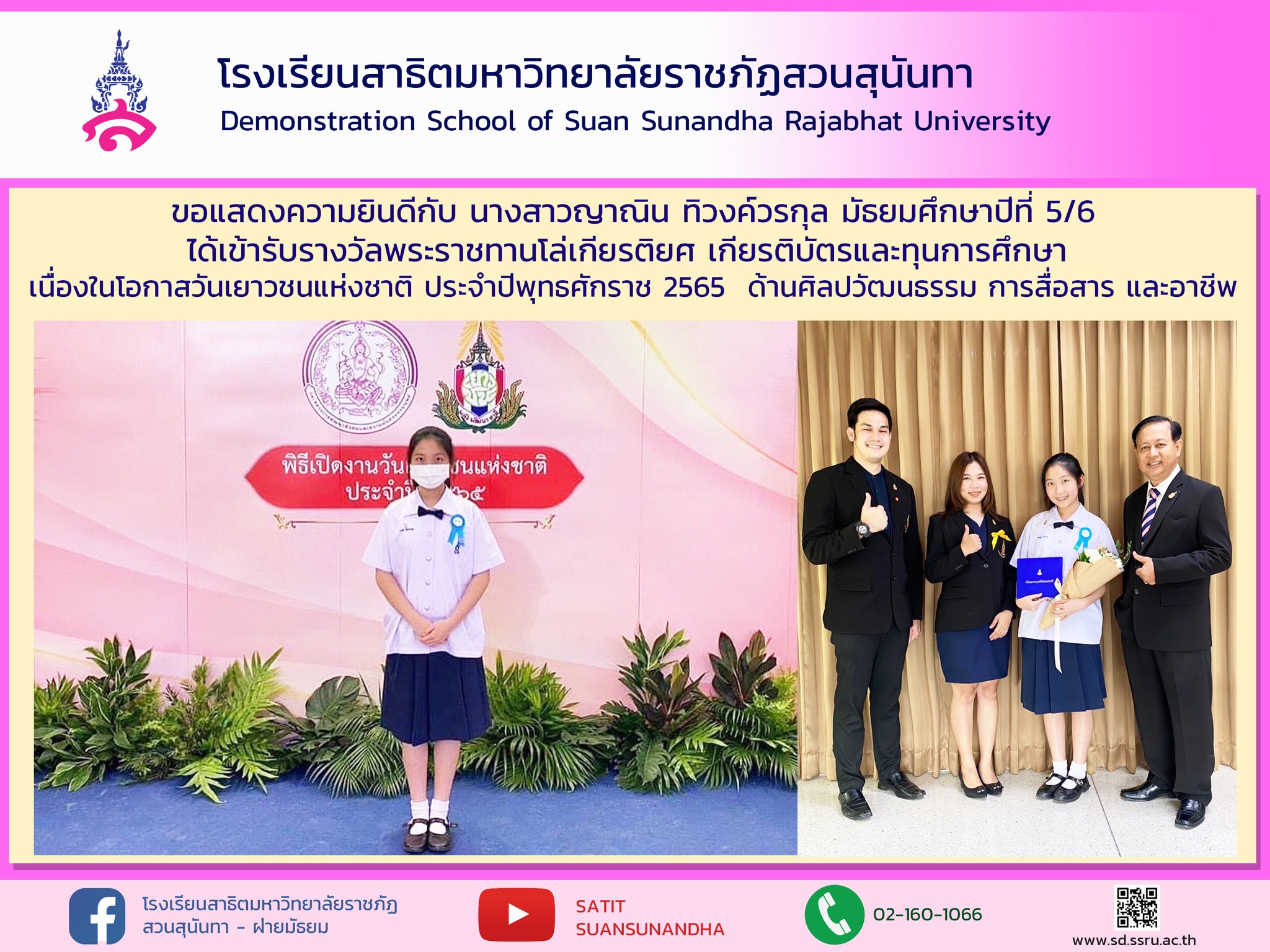 ขอแสดงความยินดีกับ นางสาวญาณิน ทิวงค์วรกุล นักเรียนชั้นมัธยมศึกษาปีที่ 5/6 ได้เข้ารับรางวัลพระราชทานโล่เกียรติยศ เกียรติบัตรและทุนการศึกษา เนื่องในโอกาสวันเยาวชนแห่งชาติ ประจำปีพุทธศักราช 2565 ด้านศิลปวัฒนธรรม การสื่อสาร และอาชีพ