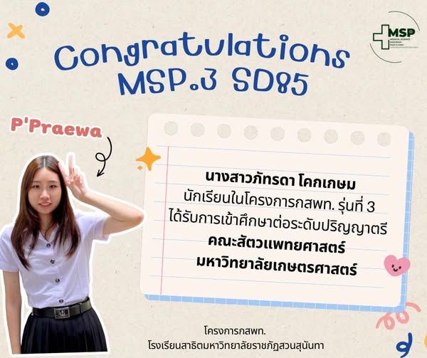 นางสาวภัทรดา โคกเกษม นักเรียนโครงการพัฒนานักเรียนสาธิตสวนสุนันทาเข้าศึกษาต่อในกลุ่มแพทย์ กสพท. และวิทยาศาสตร์สุขภาพ รุ่นที่ 3