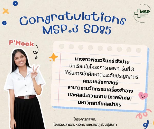 นางสาวพัชรวรินทร์ ซังปาน นักเรียนโครงการพัฒนานักเรียนสาธิตสวนสุนันทาเข้าศึกษาต่อในกลุ่มแพทย์ กสพท. และวิทยาศาสตร์สุขภาพ รุ่นที่ 3