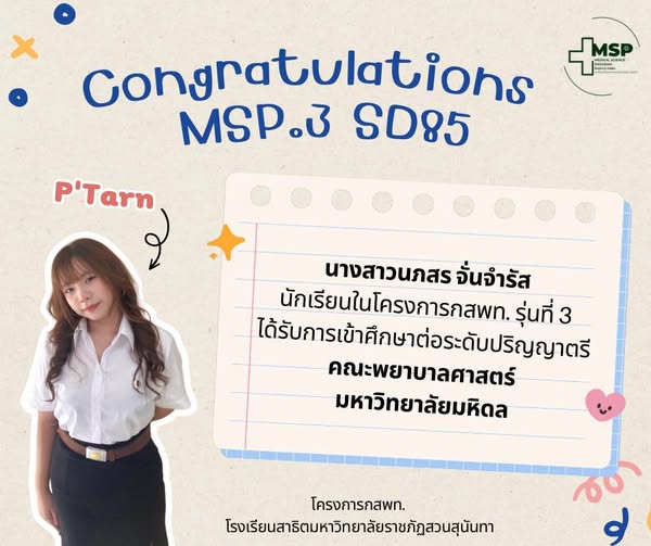 นางสาวนภสร จั่นจำรัส นักเรียนโครงการพัฒนานักเรียนสาธิตสวนสุนันทาเข้าศึกษาต่อในกลุ่มแพทย์ กสพท. และวิทยาศาสตร์สุขภาพ รุ่นที่ 3