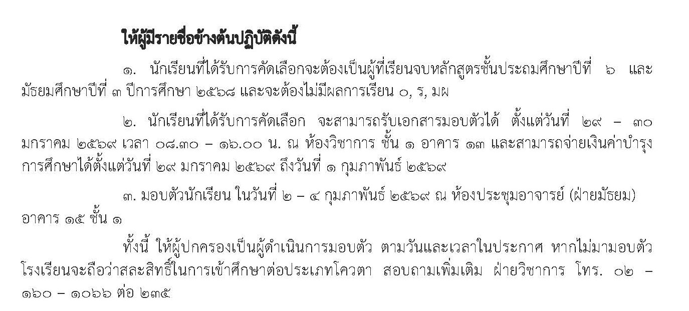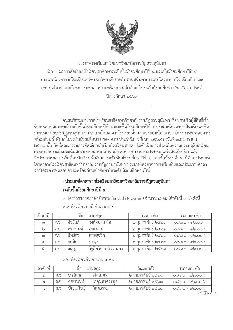 ผลการคัดเลือกนักเรียน ม.1 และ ม.4 ประเภทโควตา ประจำปีการศึกษา 2569