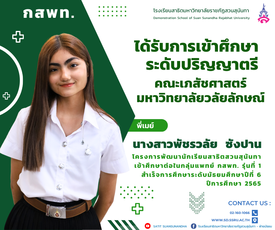 นางสาวพัชรวลัย ซังปาน นักเรียนโครงการพัฒนานักเรียนสาธิตสวนสุนันทาเข้าศึกษาต่อในกลุ่มแพทย์ กสพท. รุ่นที่ 1