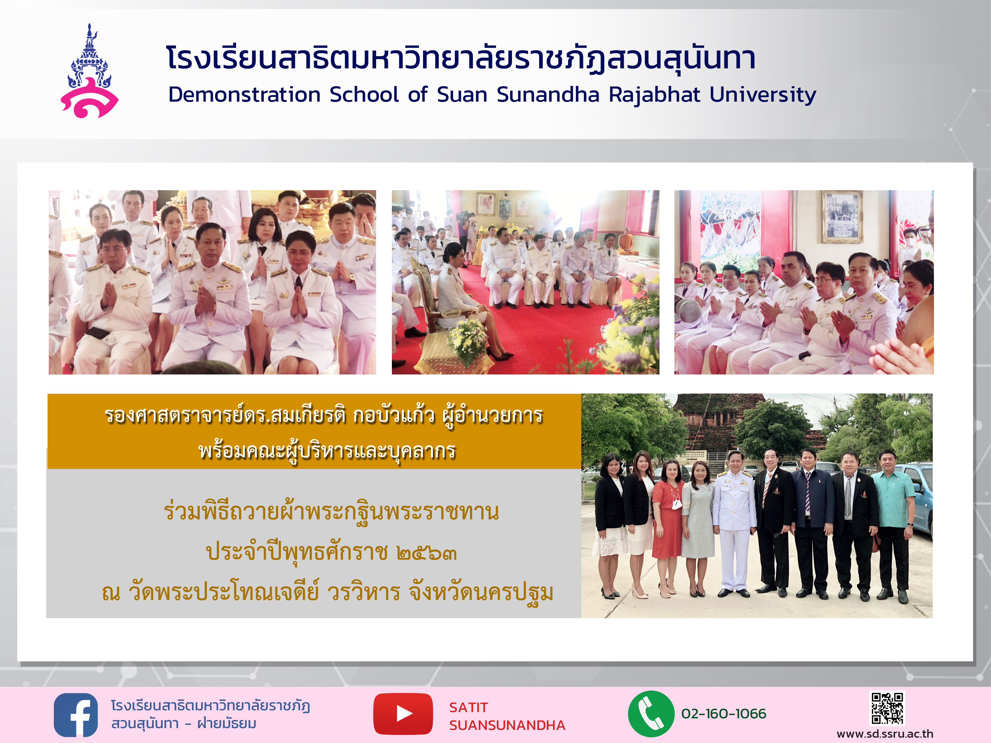 วันพฤหัสบดีที่ ๒๒ ตุลาคม ๒๕๖๓ รองศาสาตราจารย์ ดร.สมเกียรติ กอบัวแก้ว ผู้อำนวยการ พร้อมคณะผู้บริหาร และบุคลากร เข้าร่วมพิธีถวายผ้าพระกฐินพระราชทาน ณ วัดพระประโทณเจดีย์ วรวิหาร อำเภอเมือง จังหวัดนครปฐม