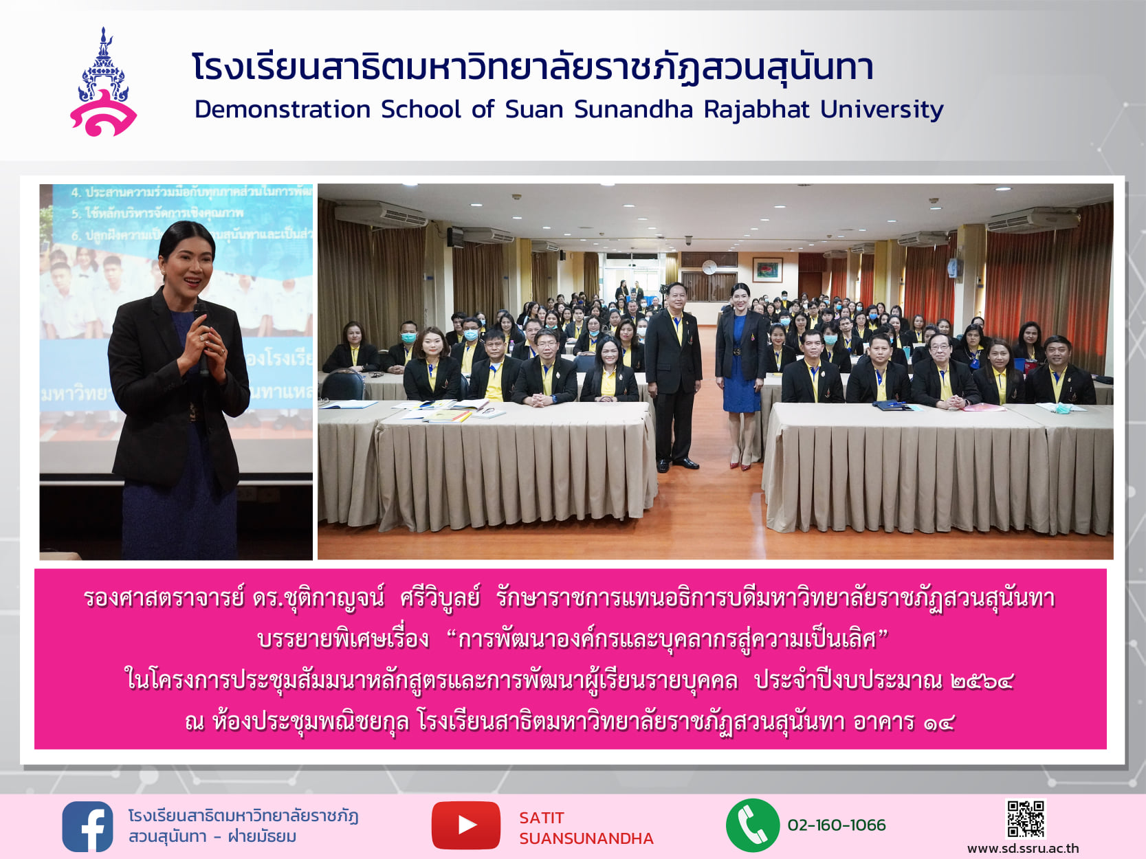 วันที่ ๑๖ พฤศจิกายน ๒๕๖๓ เวลา ๐๘.๓๐ น. คณะผู้บริหาร อาจารย์ และบุคลากรโรงเรียนสาธิต ให้การต้อนรับ รองศาสตราจารย์ ดร.ชุติกาญจน์ ศรีวิบูลย์ รักษาราชการแทนอธิการบดีมหาวิทยาลัยราชภัฏสวนสุนันทา มาบรรยายพิเศษเรื่อง "การพัฒนาองค์กรและบุคลากรสู่ความเป็นเลิศ" ในโครงการประชุมสัมมนาหลักสูตรและการพัฒนาผู้เรียนรายบุคคล ประจำปีงบประมาณ ๒๕๖๔ ณ ห้องประชุมพณิชยกุล โรงเรียนสาธิตมหาวิทยาลัยราชภัฏสวนสุนันทา อาคาร ๑๔