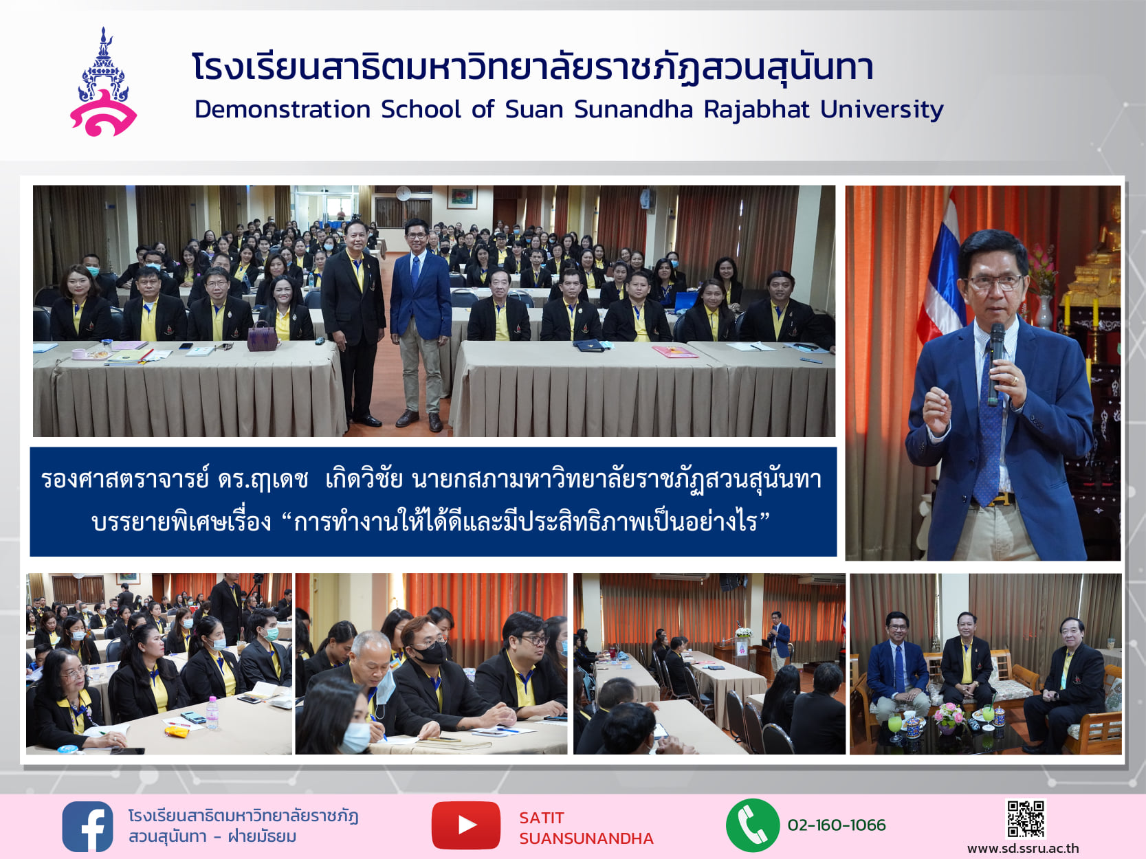 วันจันทร์ที่ ๑๖ พฤศจิกายน ๒๕๖๓ รองศาสตราจารย์ ดร.ฤๅเดช เกิดวิชัย นายกสภามหาวิทยาลัยราชภัฏสวนสุนันทา ให้เกียรติมาบรรยายพิเศษเรื่อง "การทำงานให้ได้ดีและมีประสิทธิภาพเป็นอย่างไร" ให้แก่บุคลากรโรงเรียนสาธิตมหาวิทยาลัยราชภัฏสวนสุนันทา ซึ่งได้ให้ข้อคิดต่างๆ ไว้มากมาย การสร้างเป้าหมาย การพัฒนาตัวเองอยู่ตลอดเวลา ให้แก่บุคลากรของโรงเรียนในการบรรยายพิเศษครั้งนี้ ณ ห้องประชุมพณิชยกุล อาคาร ๑๔