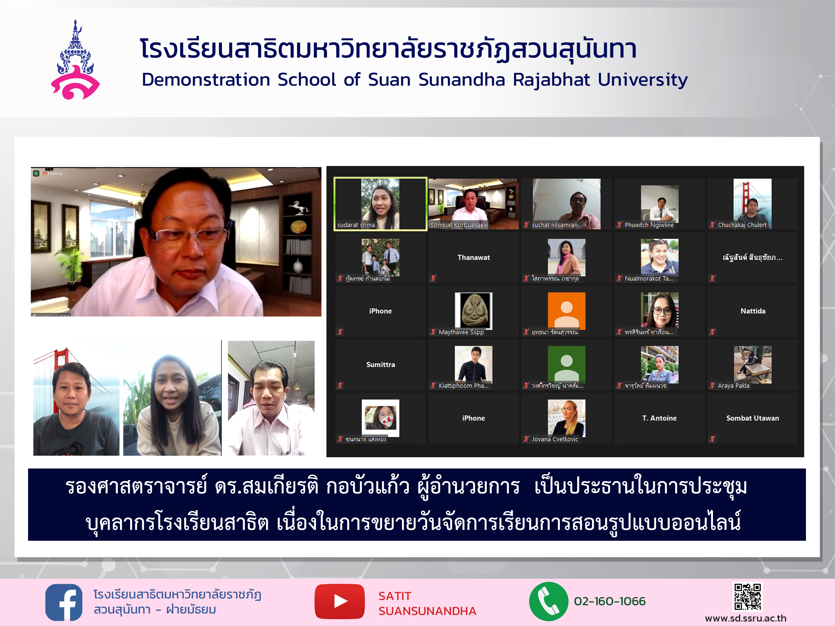 วันพฤหัสบดีที่ 14 มกราคม 2564 โรงเรียนสาธิตมหาวิทยาลัยราชภัฏสวนสุนันทา โดย รศ.ดร.สมเกียรติ กอบัวแก้ว ผู้อำนวยการ เป็นประธานในการประชุมบุคลากรโรงเรียนเนื่องในการขยายวันจัดการเรียนการสอนรูปแบบออนไลน์ เพื่อรับทราบการปฏิบัติราชการในการจัดการเรียนการสอนรูปแบบออนไลน์ ซึ่งโรงเรียนสาธิตจัดการเรียนการสอนรูปแบบออนไลน์ถึงวันที่ 29 มกราคม 2564 หรือจนกว่าจะมีประกาศเป็นอย่างอื่น