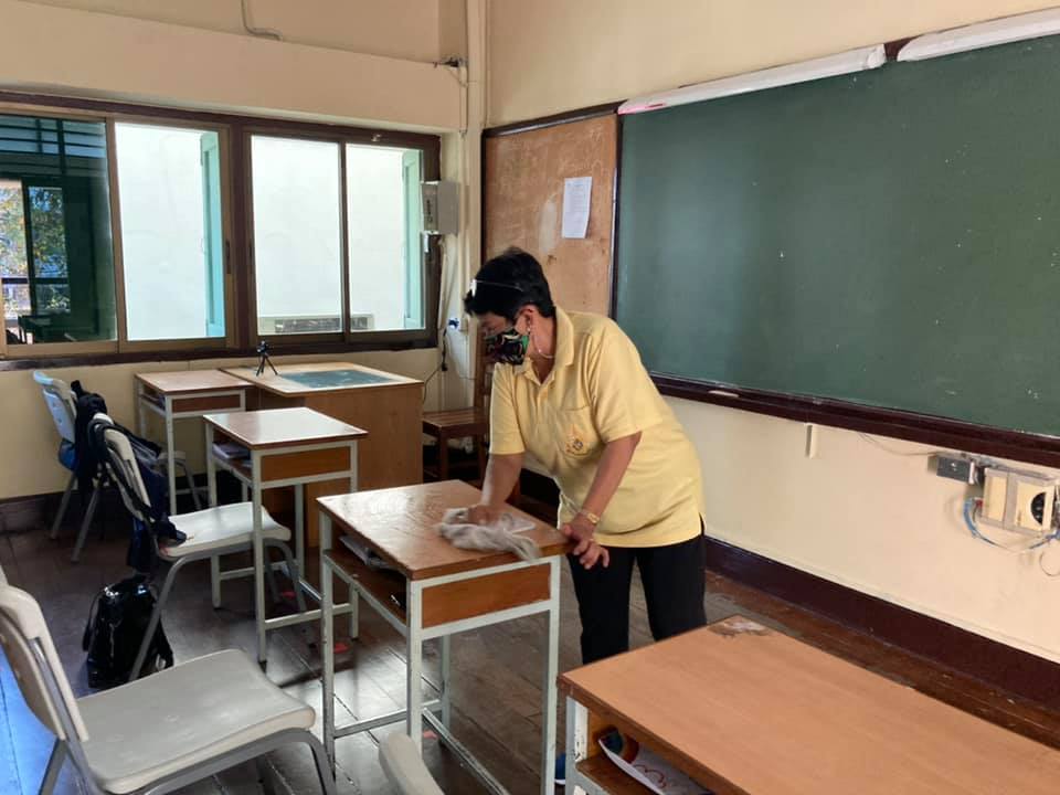 ช่วงพักกลางวัน ฝ่ายอาคารสถานที่ ทำความสะอาดโต๊ะเรียน ห้องเรียนและบริเวณที่มีการสัมผัสบ่อยๆเพื่อฆ่าเชื้อซึ่งเป็นไปตามมาตรการเฝ้าระวัง Covid -19 โดยดำเนินการตามมาตรการนี้ทุกวัน และจะมีการพ่นน้ำยาฆ่าเชื้อหลังเลิกเรียนของทุกวัน
