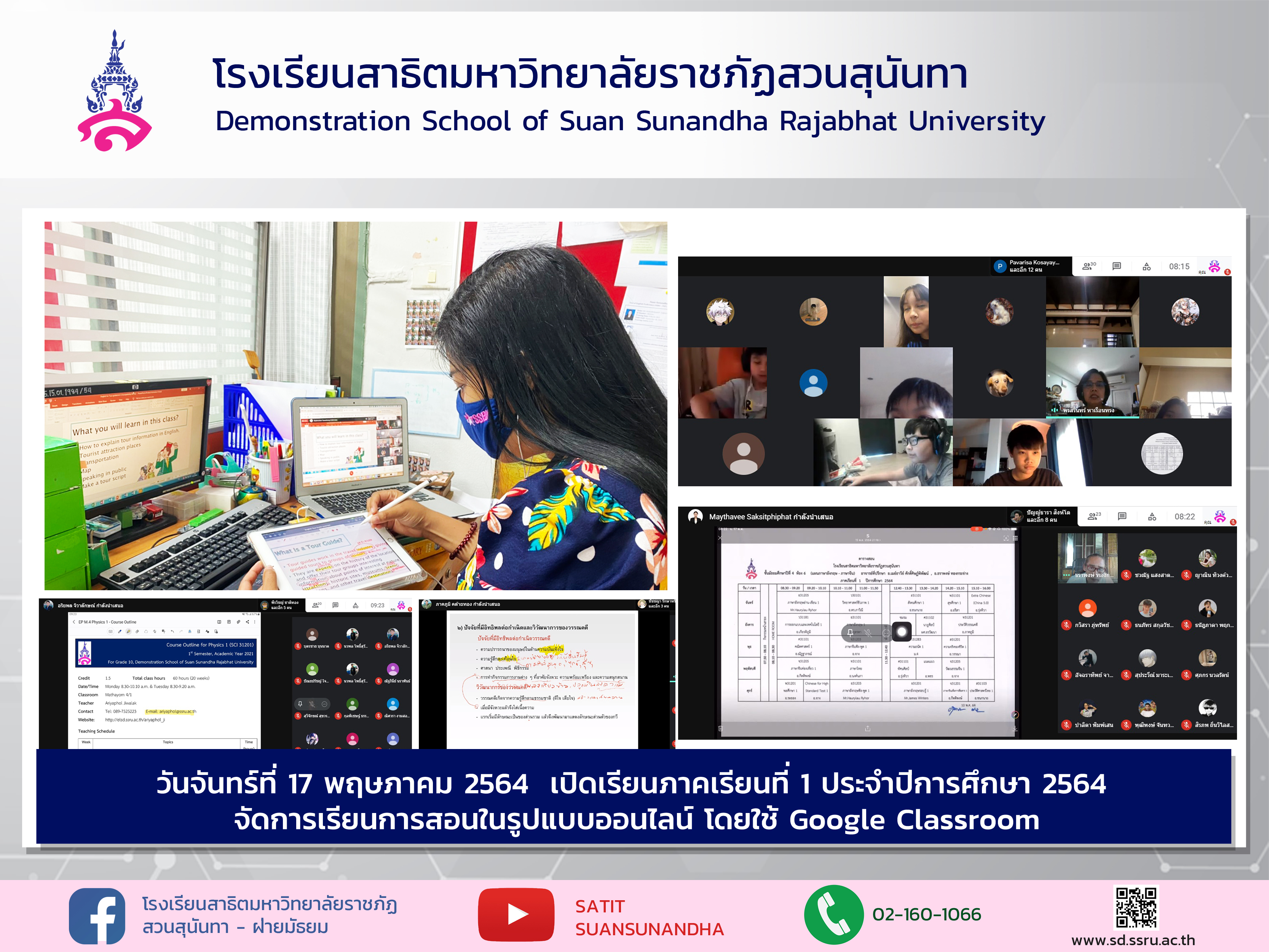 วันจันทร์ที่ 17 พฤษภาคม 2564 โรงเรียนสาธิตมหาวิทยาลัยราชภัฏสวนสุนันทา เปิดภาคเรียนที่ 1 ปีการศึกษา 2564 โดยจัดการเรียนการสอนในรูปแบบออนไลน์ อาจารย์ทุกท่านได้จัดการเตรียมการสอนให้กับนักเรียนหลากหลายรูปแบบเพื่อให้นักเรียนมีความสนุกสนานในการเรียน และได้รับความรู้อย่างเต็มที่