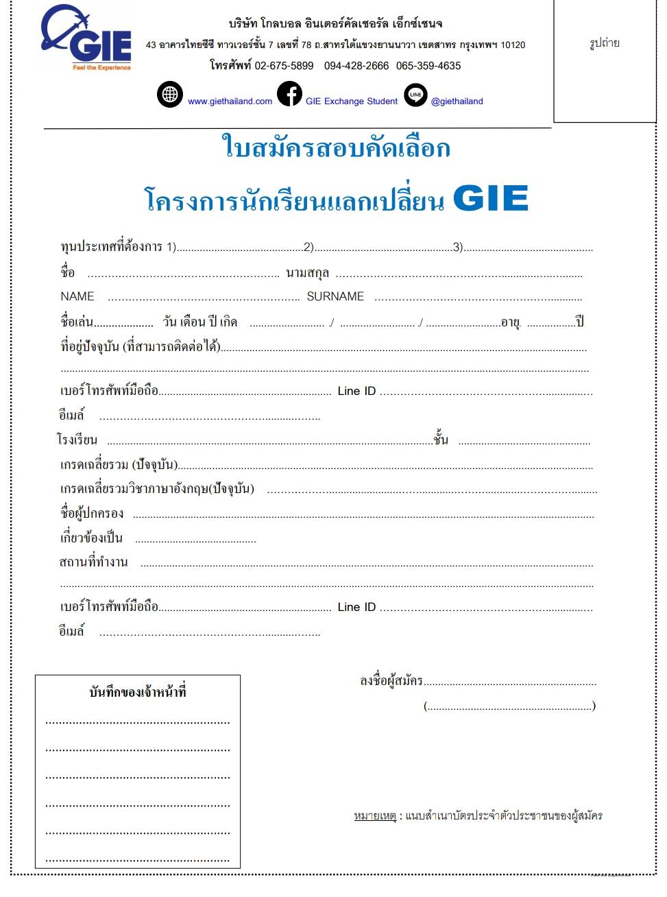 ![]() เปิดรับสมัครแล้ว โครงการนักเรียนแลกเปลี่ยน GIE ระยะยาว 1 ปี เดินทางปี 2565 ประเทศที่เปิดรับสมัคร สหรัฐอเมริกา, แคนาดา,จีน, เยอรมนี, อิตาลี, ฝรั่งเศส, ฟินแลนด์,เบลเยียม, สเปน สนใจเข้าร่วมโครงการ สมัครสอบได้ที่ อ.นวลมรกต ทวีทอง หรือพี่นกกี้ ดาวน์โหลดใบสมัครได้ที่นี่ ใบสมัคร GIE.pdf |
