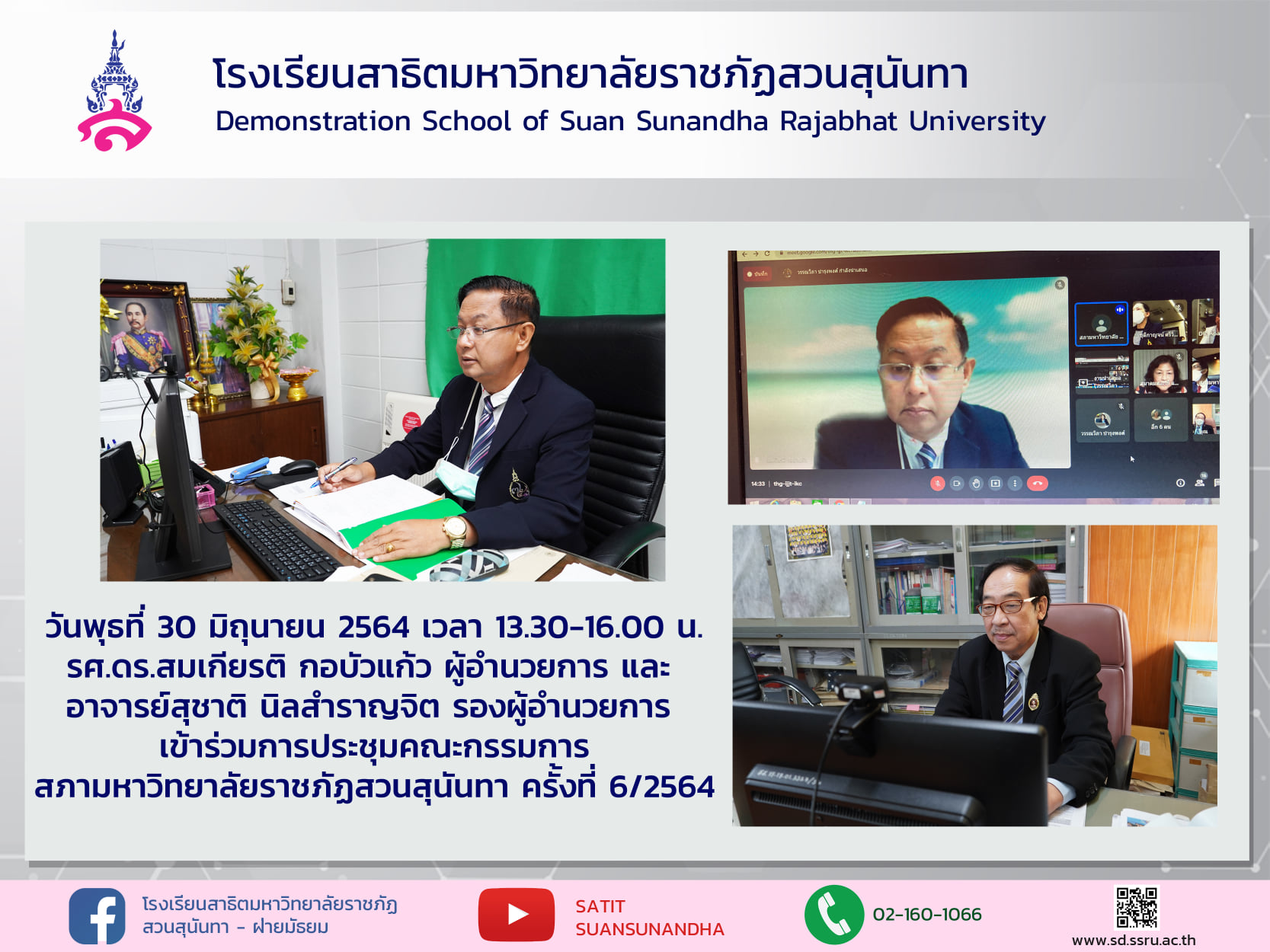 วันพุธที่ 30 มิถุนายน 2564 เวลา 13.30 - 16.00 น. รองศาสตราจารย์ ดร.สมเกียรติ กอบัวแก้ว ผู้อำนวยการ และ อาจารย์สุชาติ นิลสำราญจิต รองผู้อำนวยการ โครงการภาคภาษาอังกฤษ เข้าร่วมการประชุมสภามหาวิทยาลัยราชภัฏสวนสุนันทา ครั้งที่ 6/2564 ผ่านระบบออนไลน์โดยใช้ Google Meet ในการเข้าร่วมประชุมครั้งนี้
