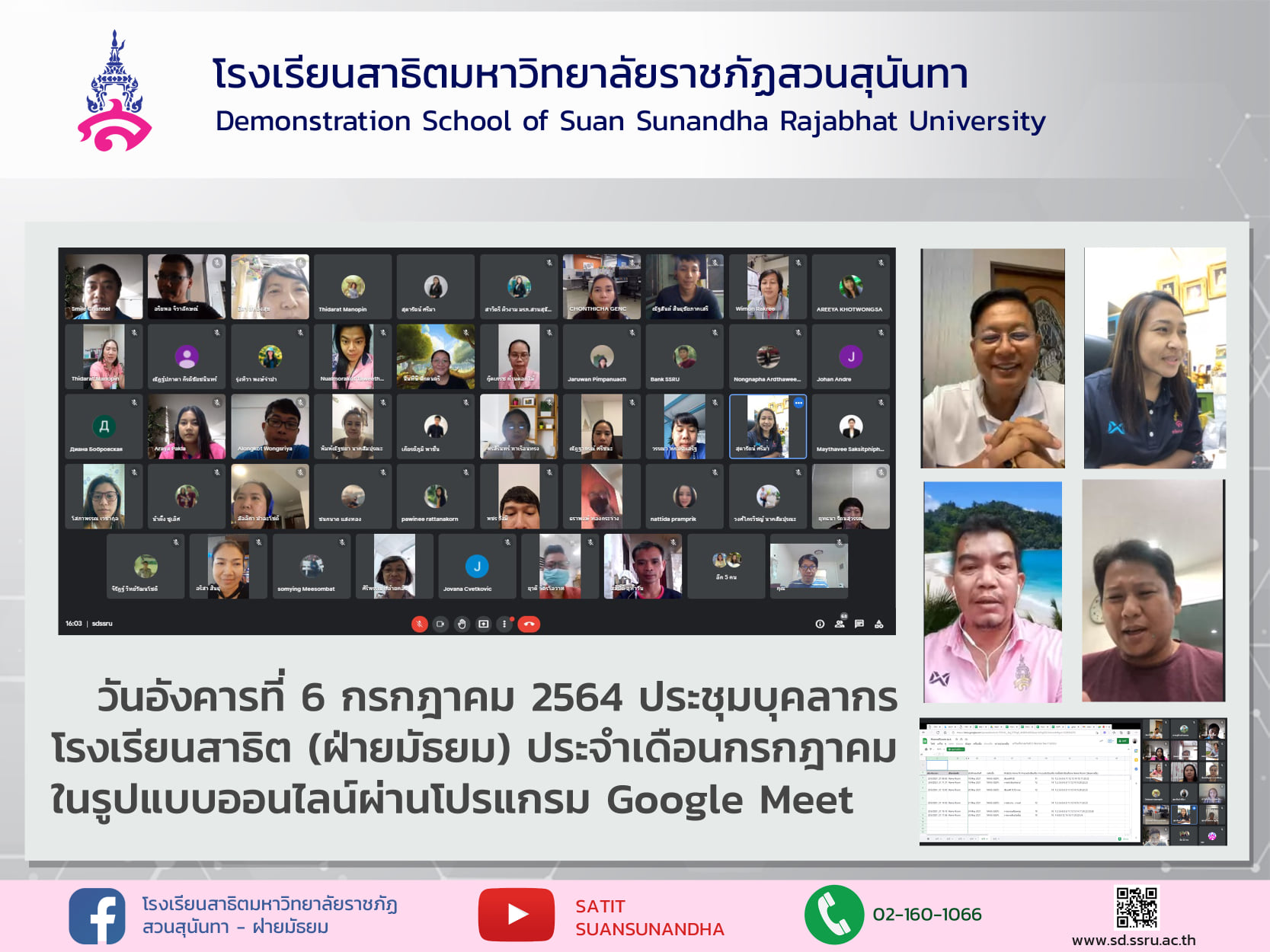 วันอังคารที่ 6 กรกฎาคม 2564 เวลา 16.00 น. โรงเรียนสาธิตมหาวิทยาลัยราชภัฏสวนสุนันทา (ฝ่ายมัธยม) ประชุมบุคลากรโรงเรียนประจำเดือนกรกฎาคม โดย รศ.ดร.สมเกียรติ กอบัวแก้ว ผู้อำนวยการ เป็นประธานในการประชุม โดยมีการชี้แจงการปฏิบัติราชการในเดือนกรกฎาคม การจัดการเรียนการสอนออนไลน์ นักเรียนที่ได้รับทุนการศึกษา และนักเรียนแลกเปลี่ยน ให้แก่บุคลากรได้รับทราบ ประชุมในรูปแบบออนไลน์ ผ่านโปรแกรม Google Meet