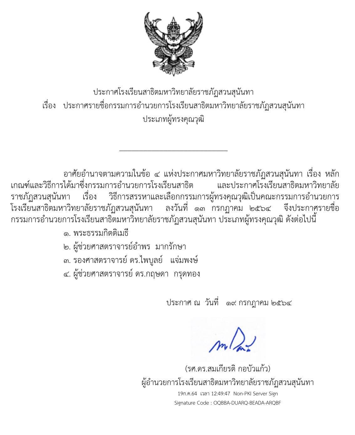 ประกาศรายชื่อกรรมการอำนวยการโรงเรียนสาธิตมหาวิทยาลัยราชภัฏสวนสุนันทา ประเภทผู้ทรงคุณวุฒิ