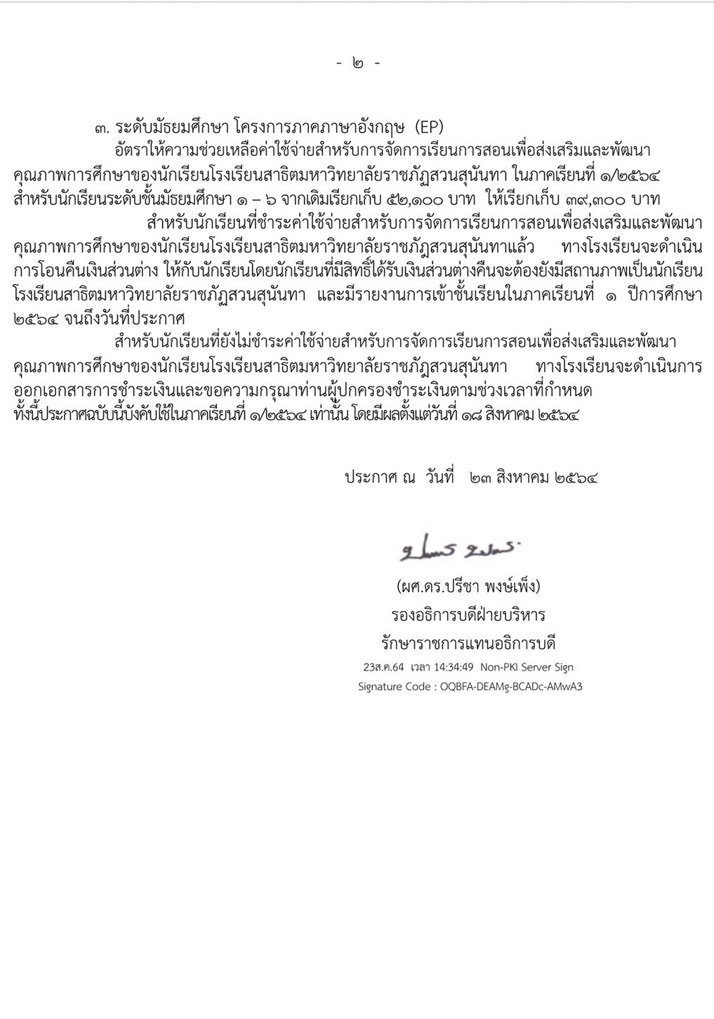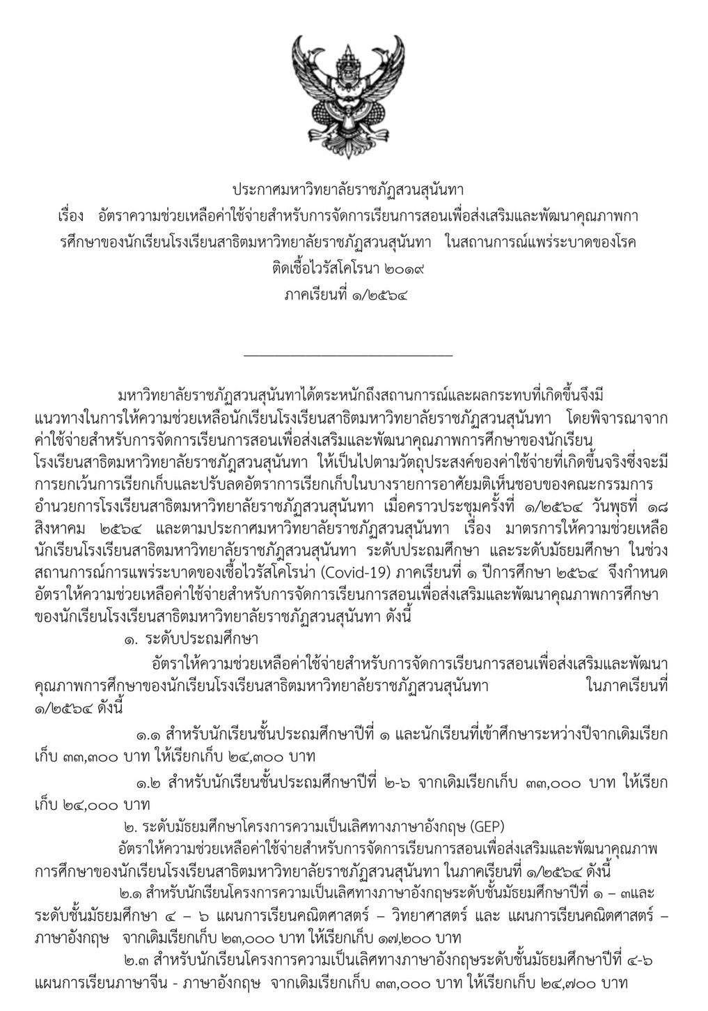 อัตราความช่วยเหลือค่าใช้จ่ายสำหรับการจัดการเรียนการสอนเพื่อส่งเสริมและพัฒนาคุณภาพการศึกษาของนักเรียนโรงเรียนสาธิตมหาวิทยาลัยราชภัฏสวนสุนันทา