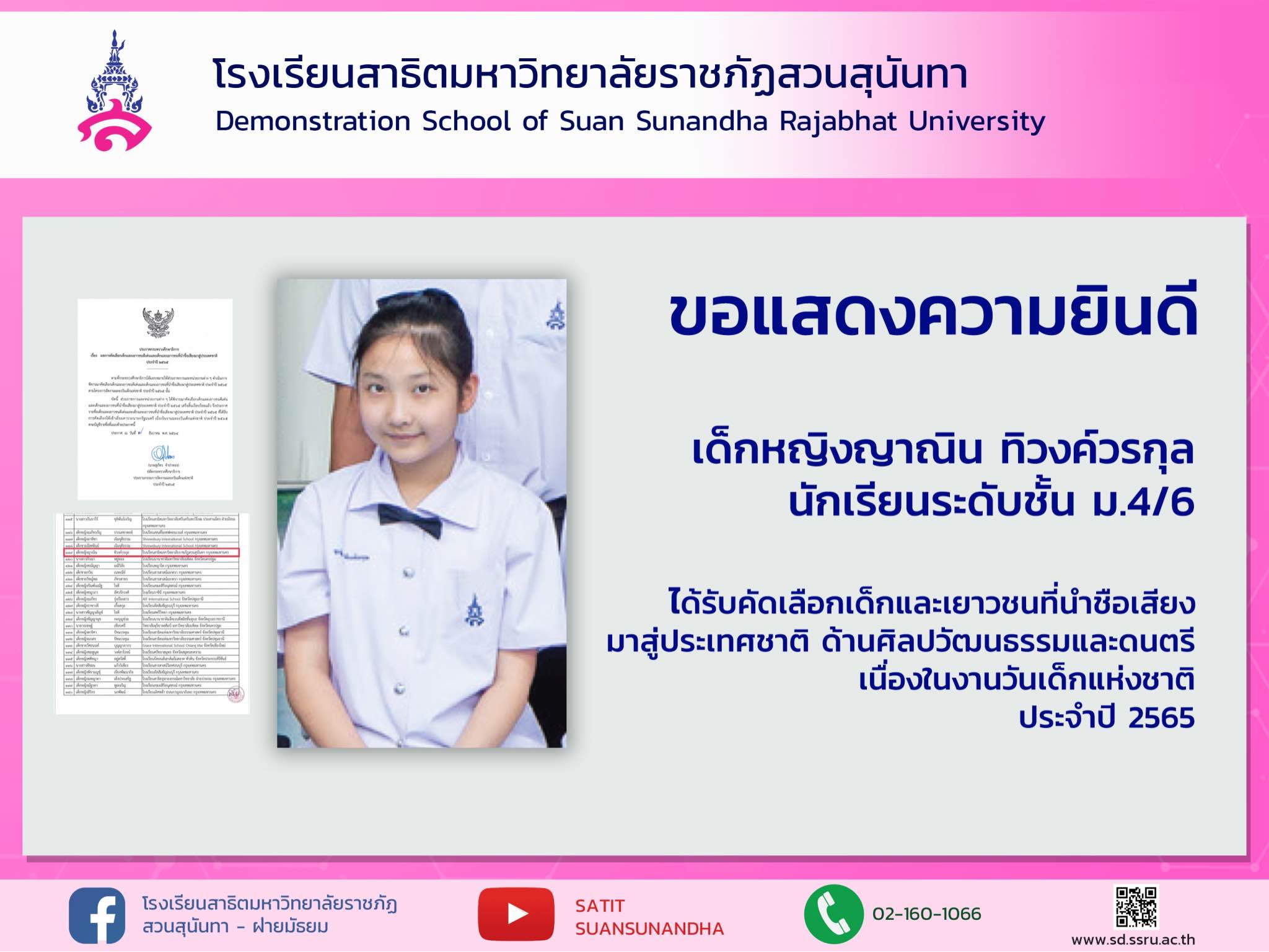 ขอแสดงความยินดีกับ เด็กหญิงญาณิน ทิวงค์วรกุล นักเรียนระดับชั้นมัธยมศึกษาปีที่ 4/6 ได้รับคัดเลือกเด็กและเยาวชนที่นำชื่อเสียงมาสู่ประเทศชาติ ด้านศิลปวัฒนธรรมและดนตรี เนื่องในงานวันเด็กแห่งชาติ ประจำปี 2565