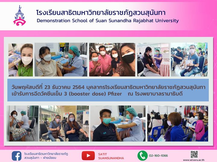 วันพฤหัสบดีที่ 23 ธันวาคม 2564 บุคลากรโรงเรียนสาธิตมหาวิทยาลัยราชภัฏสวนสุนันทา เข้ารับการฉีดวัคซีน เข็ม 3 Pfizer (booster dose) ณ โรงพยาบาลรามาธิบดี