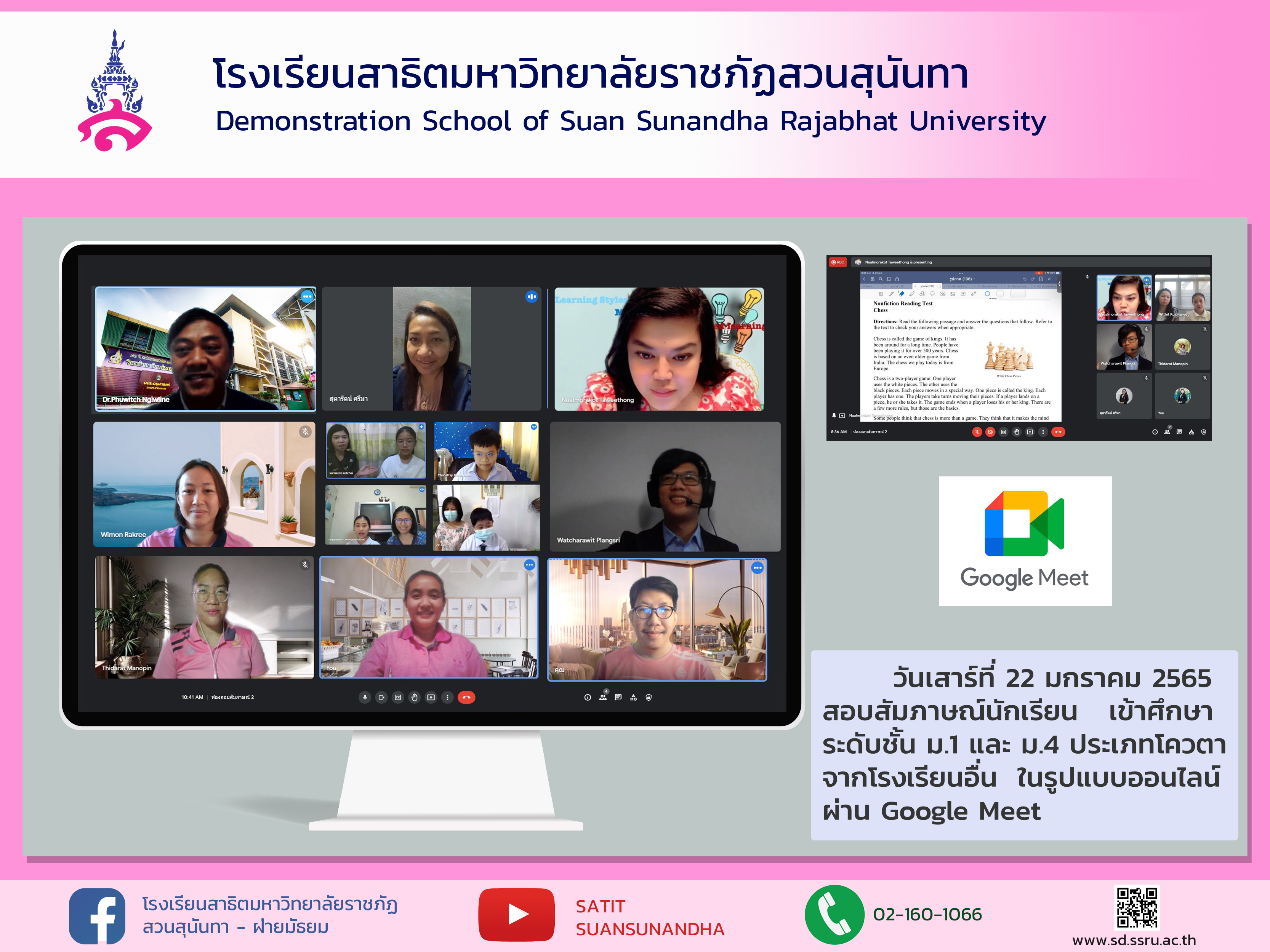 วันเสาร์ที่ 22 มกราคม 2565 โรงเรียนสาธิตมหาวิทยาลัยราชภัฏสวนสุนันทา จัดการสอบสัมภาษณ์นักเรียนเข้าศึกษาระดับชั้นมัธยมศึกษาปีที่ 1 และ มัธยมศึกษาปีที่ 4 ประเภทโควตา จากโรงเรียนอื่น ประจำปีการศึกษา 2565 ในรูปแบบออนไลน์ ผ่านโปรแกรม Google Meet
