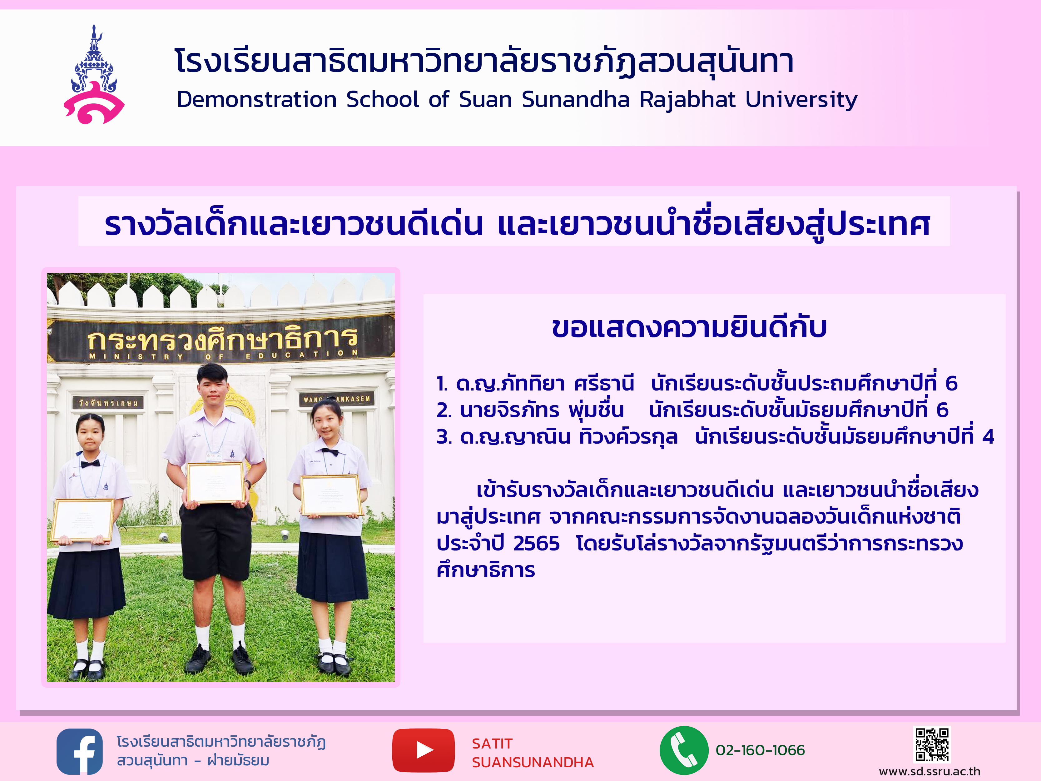 วันจันทร์ที่ 14 กุมภาพันธ์ 2565 นักเรียนโรงเรียนสาธิตมหาวิทยาลัยราชภัฏสวนสุนันทา ได้รับรางวัลเด็กและเยาวชนดีเด่น และเยาวชนนำชื่อเสียงสู่ประเทศ เข้ารับโล่รางวัล เนื่องในวันเด็กแห่งชาติประจำปี 2565 ได้รับมอบจาก นางสาวตรีนุช เทียนทอง รัฐมนตรีว่าการกระทรวงศึกษาธิการ ณ กระทรวงศึกษาธิการ