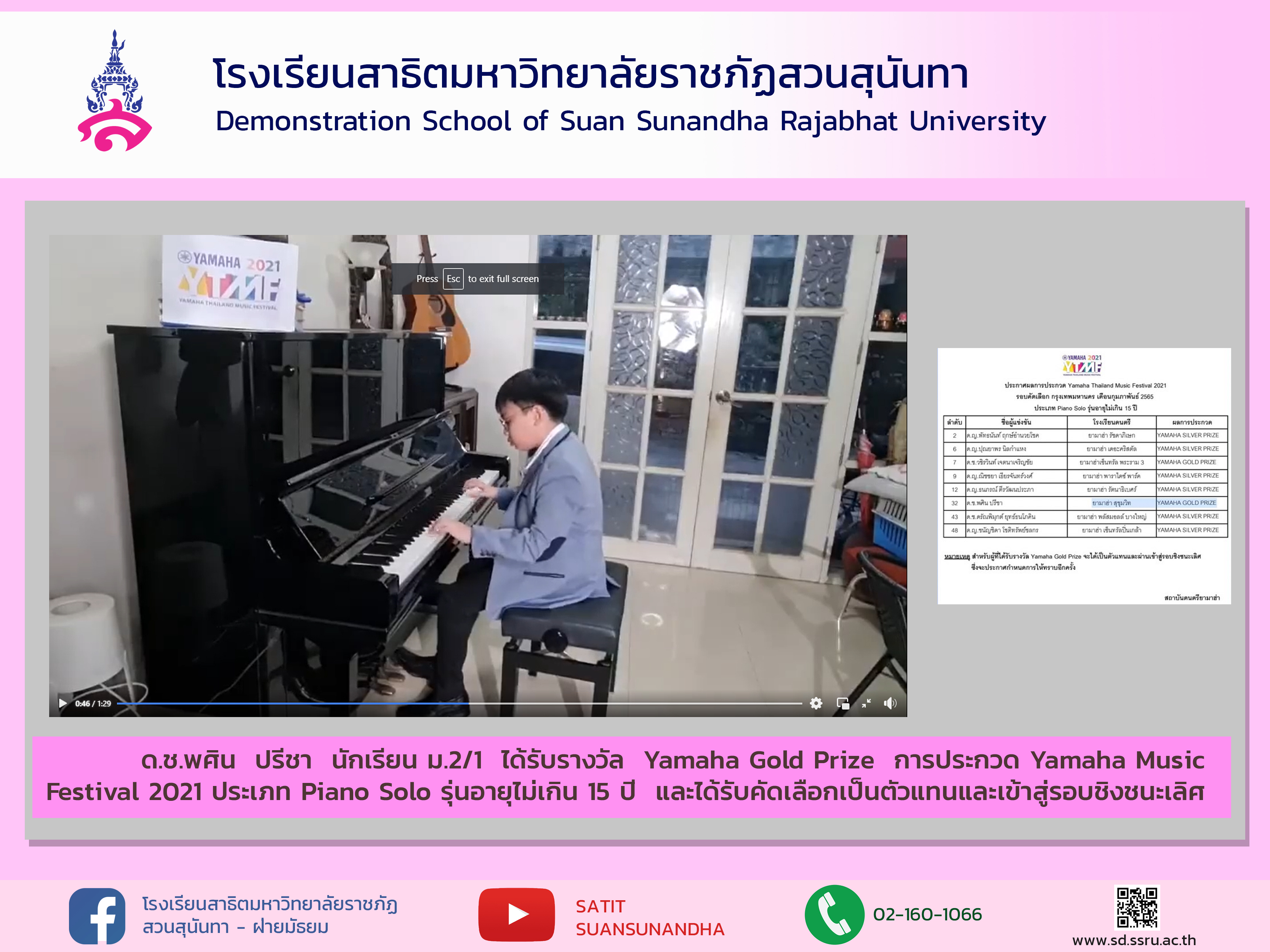 ขอแสดงความยินดีแก่ ดช.พศิน ปรีชา นักเรียนระดับชั้นมัธยมศึกษาปีที่ 2/1 ได้รับรางวัล ได้รับรางวัล Yamaha Gold Prize ในการประกวด Yamaha Music Festival 2021 ประเภท Piano Solo รุ่นอายุไม่เกิน 15 ปี รอบคัดเลือกกรุงเทพมหานคร ประจำเดือนกุมภาพันธ์ ได้รับคัดเลือกเป็นตัวแทนและเข้าสู่รอบชิงชนะเลิศ