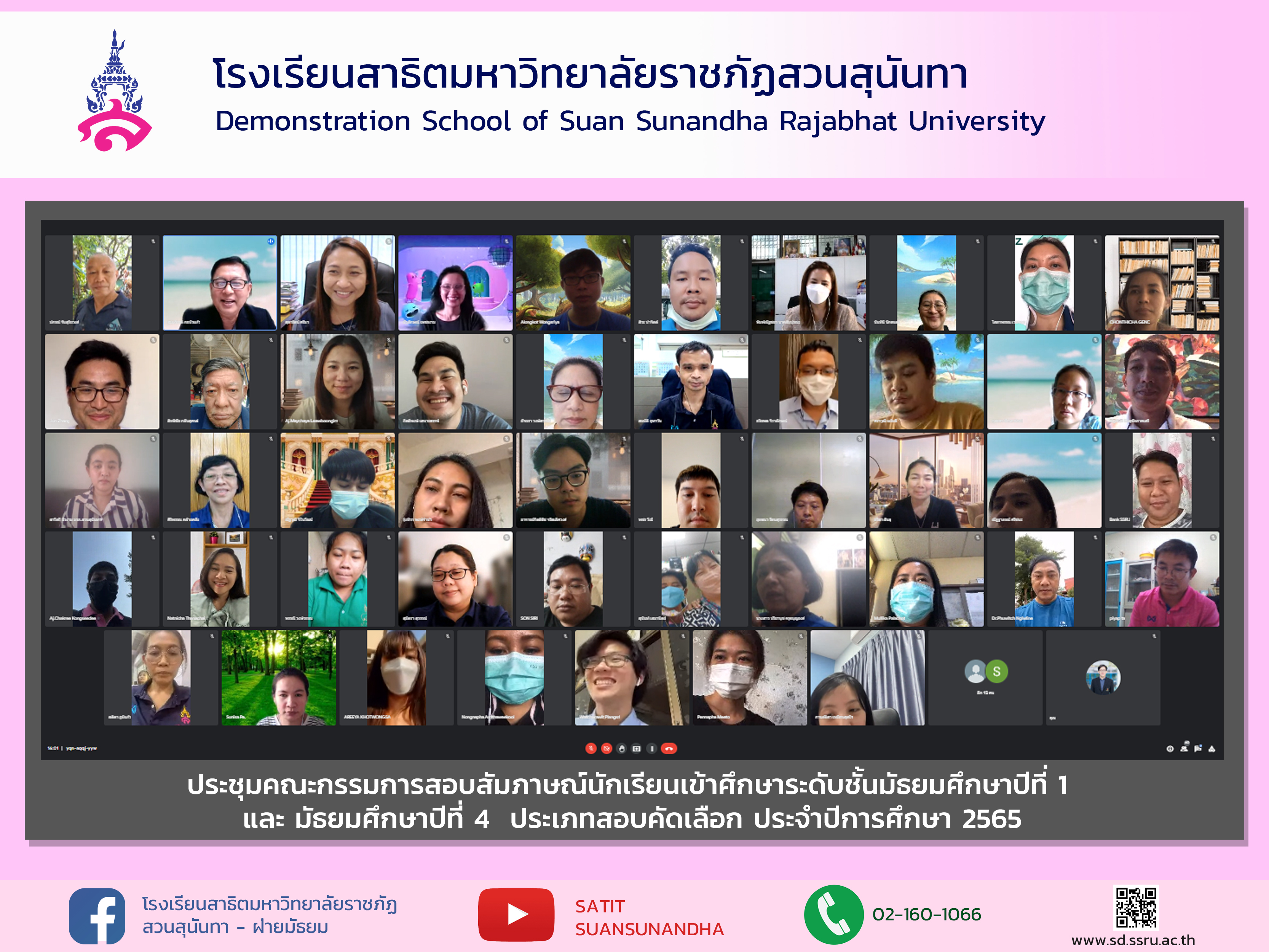 วันพุธที่ 16 มีนาคม 2565 เวลา 15.00 น. รศ.ดร.สมเกียรติ กอบัวแก้ว ผู้อำนวยการโรงเรียน เป็นประธานในการประชุมคณะกรรมการสอบสัมภาษณ์นักเรียนเพื่อเข้าศึกษาระดับชั้นมัธยมศึกษาปีที่ 1 และ มัธยมศึกษาปีที่ 4 ประเภทสอบคัดเลือก ประจำปีการศึกษา 2565 โดยโรงเรียนจัดให้มีการสอบสัมภาษณ์ในวันเสาร์ที่ 19 มีนาคม 2565 เวลา 8.30 - 16.00 น. ณ โรงเรียนสาธิตมหาวิทยาลัยราชภัฏสวนสุนันทา ซึ่งคณะกรรมการในการสอบสัมภาษณ์ทุกท่าน จะต้องผ่านการตรวจ ATK ก่อนเข้าปฏิบัติงานในการสอบสัมภาษณ์ครั้งนี้ เพื่อสร้างความเชื่อมั่นให้แก่นักเรียนและผู้ปกครองที่ได้เข้ารับการสอบสัมภาษณ์
