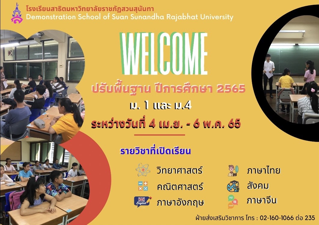 โรงเรียนสาธิตมหาวิทยาลัยราชภัฏสวนสุนันทา เปิดเรียนปรับพื้นฐาน ระดับชั้น ม.1 และ ม.4 ประจำปีการศึกษา 2565 ระหว่างวันที่ 4 เมษายน - 6 พฤษภาคม 2565 ในรูปแบบ Onsite ณ โรงเรียน โดยมีมาตรการและแนวปฏิบัติเพื่อป้องกันและควบคุมการแพร่ระบาดของโรคโควิด-19 (COVID 19) ตามมาตรการสุขอนามัยส่วนบุคคล 6 มาตรการหลัก (DHMT-RC) , 6 มาตรการเสริม (SSET-CQ) และ 7 มาตรการเข้มงวดสำหรับสถานศึกษา
