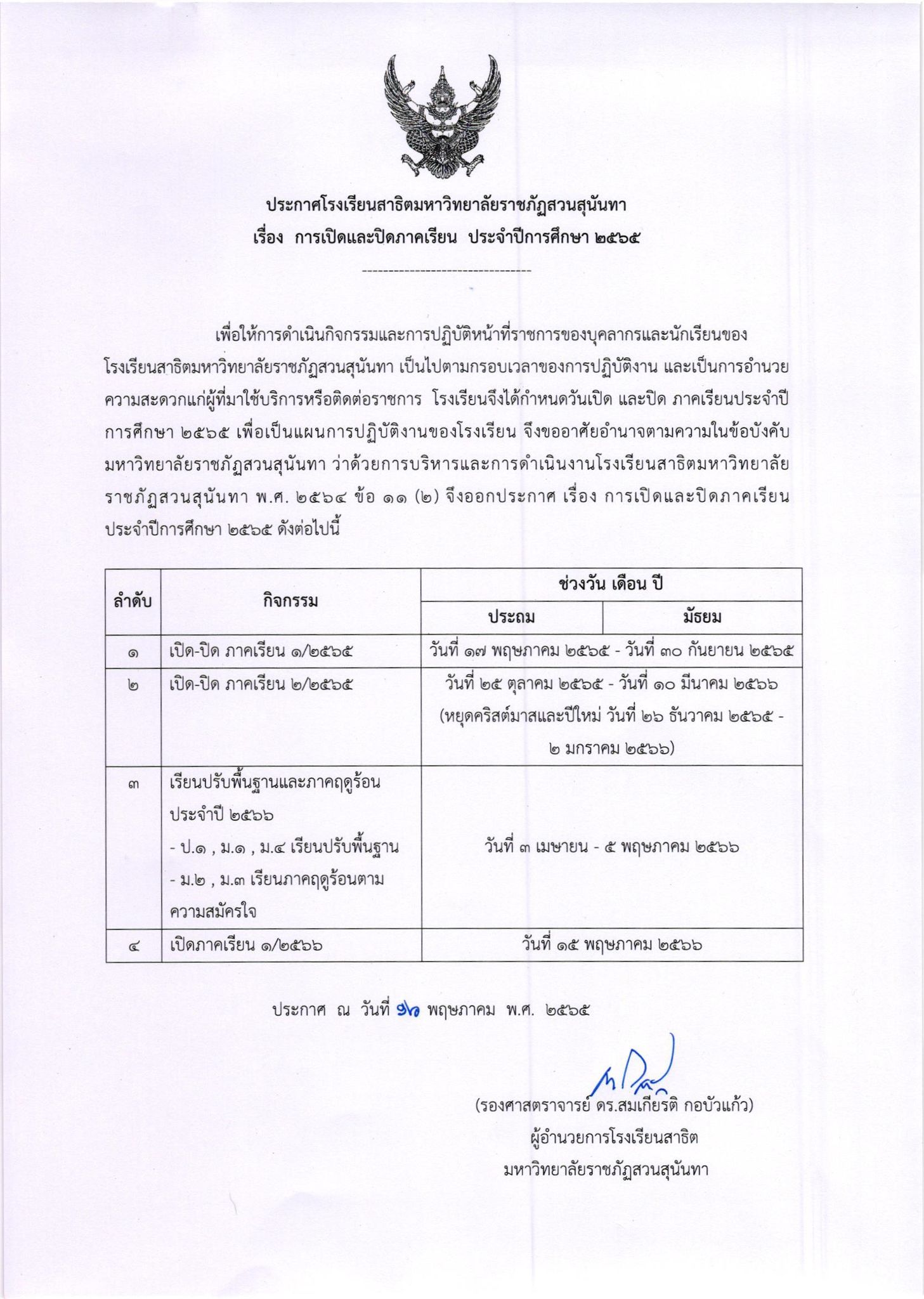 > ประกาศ การเปิดและปิดภาคเรียน ประจำปีการศึกษา 2565