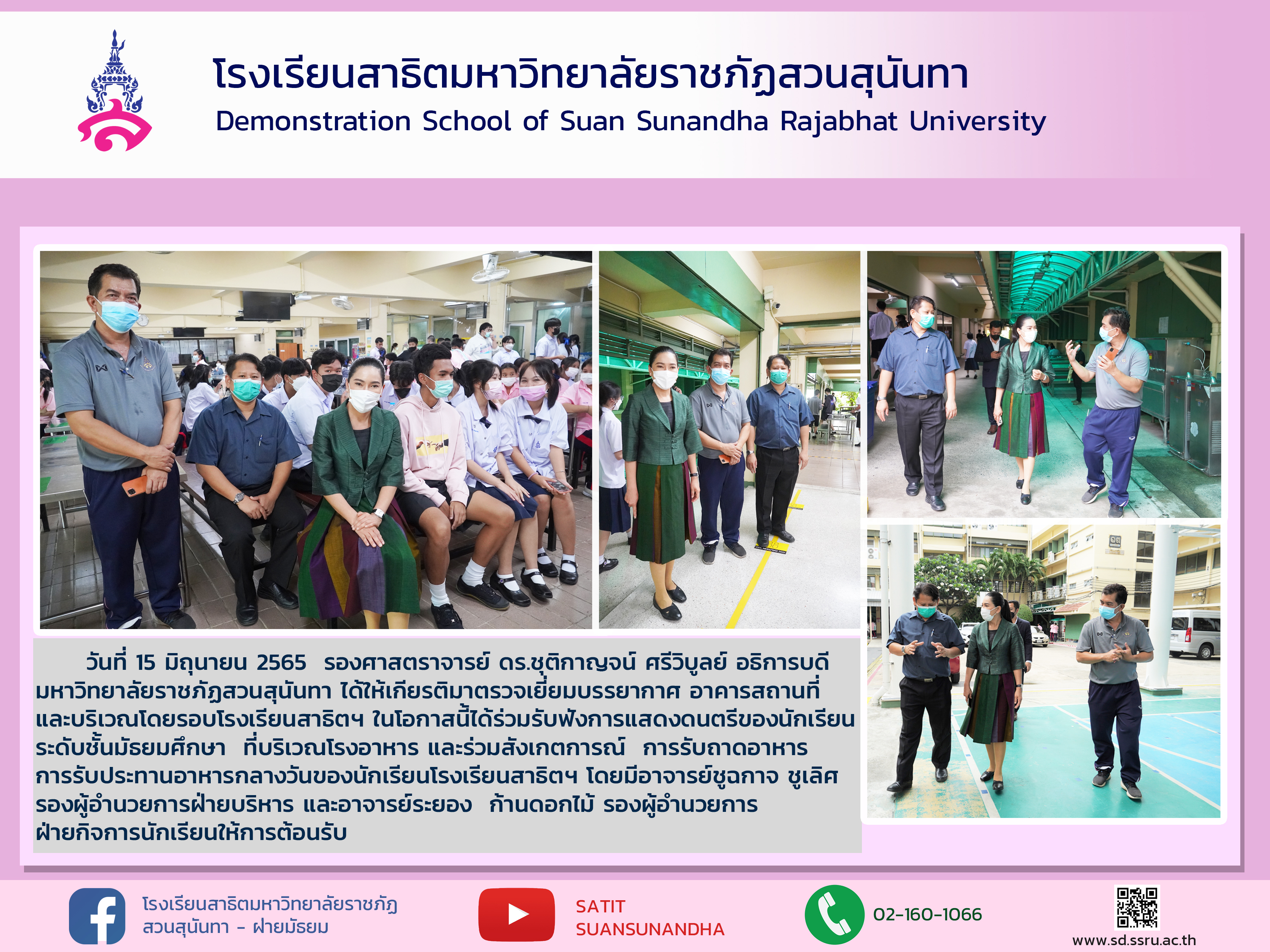 ด้วยในวันที่ 15 มิถุนายน 2565 รศ.ดร.ชุติกาญจน์ ศรีวิบูลย์ อธิการบดีมหาวิทยาลัยราชภัฏสวนสุนันทา ได้ให้เกียรติมาตรวจเยี่ยมบรรยากาศ อาคารสถานที่ และบริเวณโดยรอบโรงเรียนสาธิตฯ ในโอกาสนี้ได้ร่วมรับฟังการแสดงดนตรีของนักเรียนระดับชั้นมัธยมศึกษาที่บริเวณโรงอาหาร และร่วมสังเกตการณ์ การรับถาดอาหาร การรับประทานอาหารกลางวันของนักเรียนโรงเรียนสาธิตฯ โดยมีอาจารย์ชูฉกาจ ชูเลิศ รองผู้อำนวยการฝ่ายบริหาร และอาจารย์ระยอง ก้านดอกไม้ รองผู้อำนวยการฝ่ายกิจการนักเรียนให้การต้อนรับ