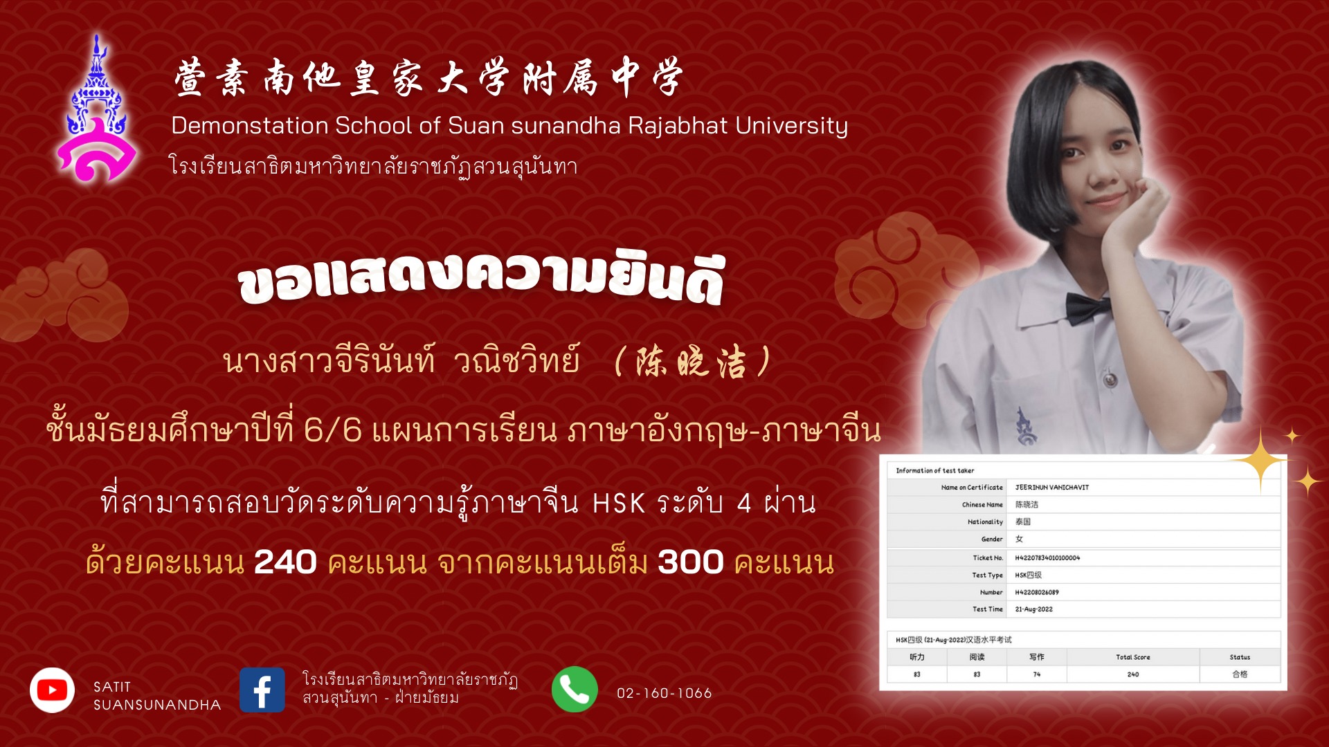 ขอแสดงความยินดีกับนักเรียนคนเก่งแห่งโรงเรียนสาธิตมหาวิทยาลัยราชภัฏสวนสุนันทา สอบผ่านวัดระดับภาษาจีน HSK ระดับ 4 ประจำปีการศึกษา 2565