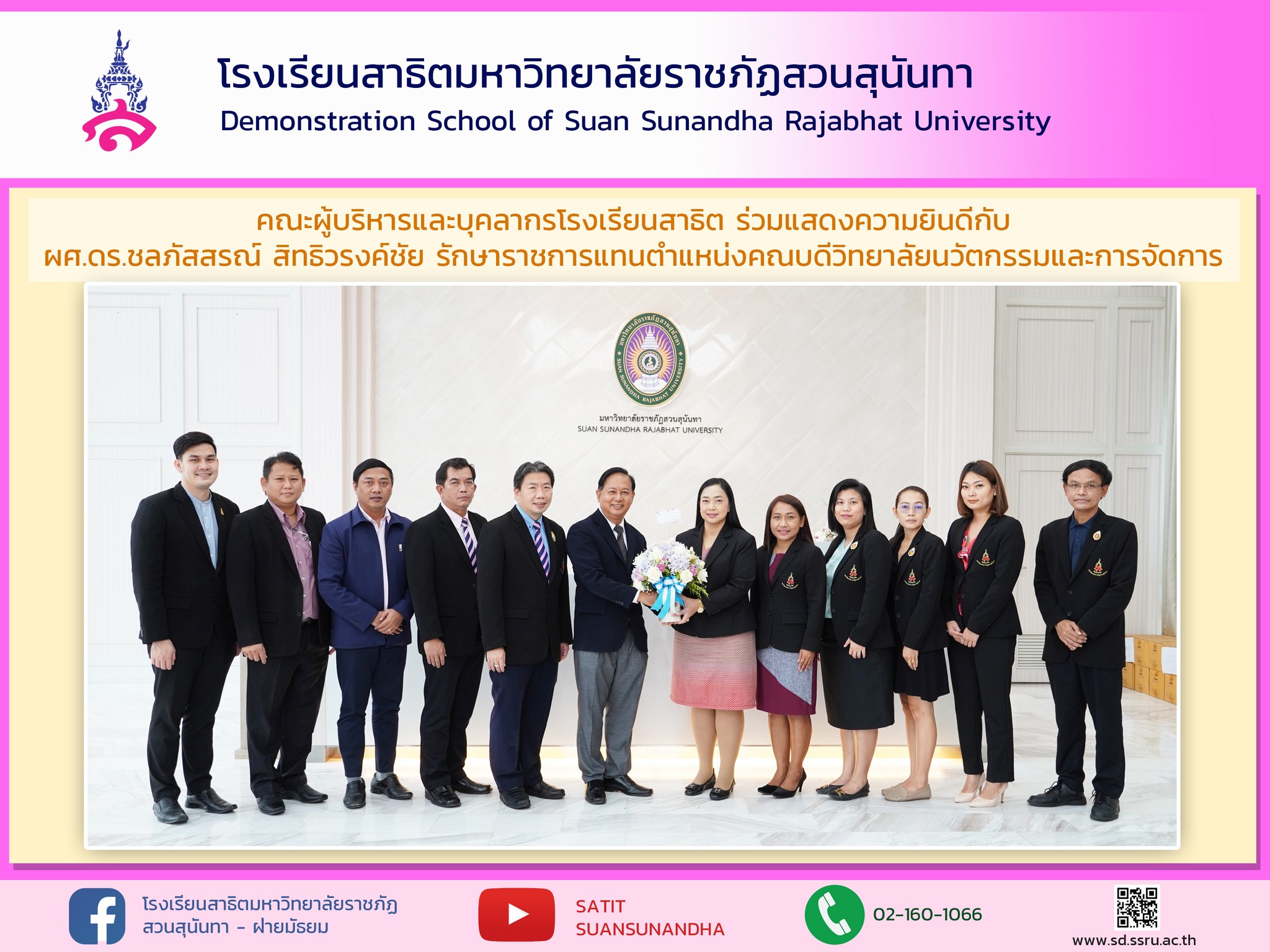 คณะผู้บริหาร อาจารย์และบุคลากรโรงเรียนสาธิตมหาวิทยาลัยราชภัฏสวนสุนันทา มอบแจกันดอกไม้ร่วมแสดงความยินดีกับ ผศ.ดร.ชลภัสสรณ์ สิทธิวรงค์ชัย รักษาราชการแทนตำแหน่งคณบดีวิทยาลัยนวัตกรรมและการจัดการ มหาวิทยาลัยราชภัฏสวนสุนันทา