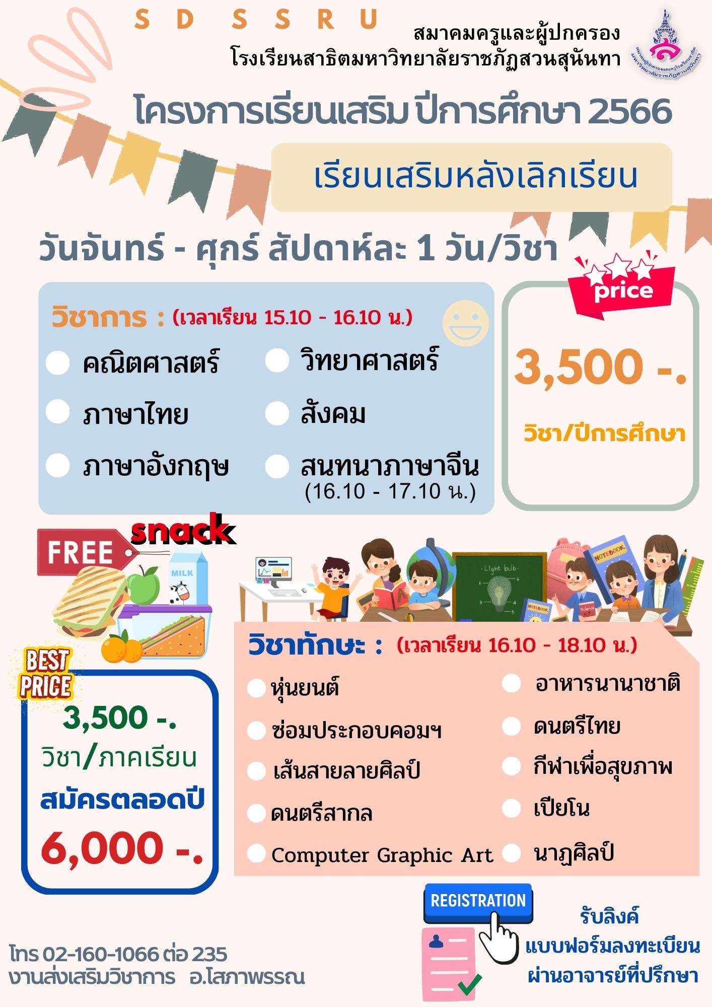 สมาคมผู้ปกครองและครู โรงเรียนสาธิตมหาวิทยาลัยราชภัฏสวนสุนันทา ร่วมกับ ฝ่ายส่งเสริมวิชาการ ได้จัดโครงการเรียนเสริม ประจำปีการศึกษา 2566