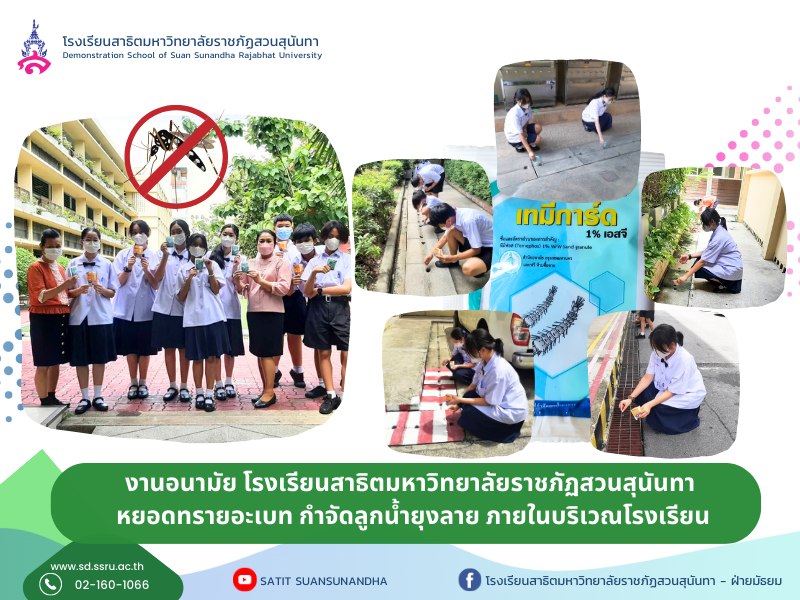 ทีมงานอนามัยโรงเรียนสาธิตมหาวิทยาลัยราชภัฏสวนสุนันทา โดย อาจารย์อริสา สินธุ นำนักเรียนร่วมกันหยอดทรายอะเบท กำจัดลูกน้ำยุงลาย ภายในท่อระบายน้ำบริเวณโรงเรียนสาธิต เพื่อเป็นการกำจัดลูกน้ำยุงลาย ป้องกันการแพร่ระบาดของโรคไข้เลือดออก ให้โรงเรียนเป็นสถานที่ปลอดภัยต่อนักเรียนและบุคลากรของโรงเรียน