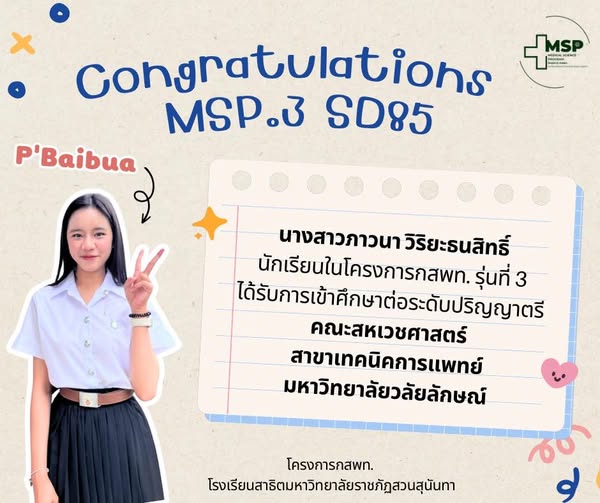 นางสาวภาวนา วิริยะธนสิทธิ์ นักเรียนโครงการพัฒนานักเรียนสาธิตสวนสุนันทาเข้าศึกษาต่อในกลุ่มแพทย์ กสพท. และวิทยาศาสตร์สุขภาพ รุ่นที่ 3