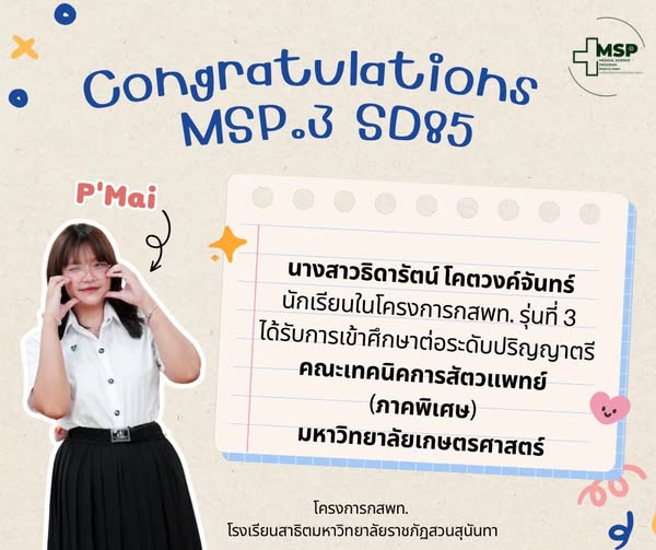 นางสาวธิดารัตน์ โคตวงค์จันทร์ นักเรียนโครงการพัฒนานักเรียนสาธิตสวนสุนันทาเข้าศึกษาต่อในกลุ่มแพทย์ กสพท. และวิทยาศาสตร์สุขภาพ รุ่นที่ 3
