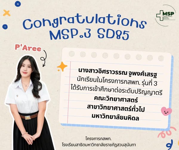นางสาวอิศราวรรณ จูพงศ์เสรฐ นักเรียนโครงการพัฒนานักเรียนสาธิตสวนสุนันทาเข้าศึกษาต่อในกลุ่มแพทย์ กสพท. และวิทยาศาสตร์สุขภาพ รุ่นที่ 3