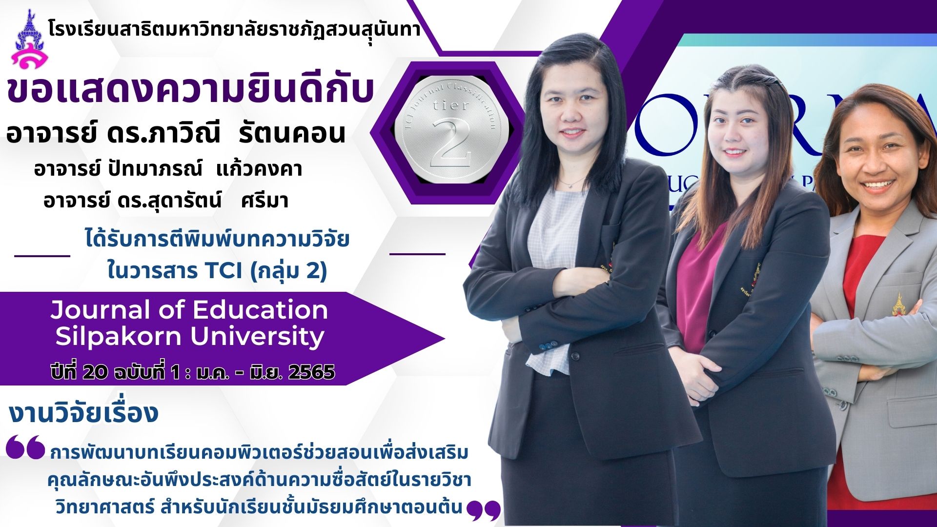 โรงเรียนสาธิตมหาวิทยาลัยราชภัฏสวนสุนันทาขอแสดงความยินดีกับ อาจารย์ ดร.ภาวิณี รัตนคอน อาจารย์กลุ่มสาระการเรียนรู้วิทยาศาสตร์และเทคโนโลยี ผู้วิจัยหลัก ร่วมกับ อาจารย์ปัทมาภรณ์ แก้วคงคา และ อาจารย์ ดร.สุดารัตน์ ศรีมา ผู้ร่วมวิจัย ได้รับการตีพิมพ์บทความวิจัยในวารสาร TCI (กลุ่ม 2) Journal of Education Silpakorn University ปีที่ 20 ฉบับที่ 1 เดือน มกราคม - มิถุนายน 2565 เรื่อง การพัฒนาบทเรียนคอมพิวเตอร์ช่วยสอนเพื่อส่งเสริมคุณลักษณะอันพึงประสงค์ด้านความซื่อสัตย์ในรายวิชาวิทยาศาสตร์ สำหรับนักเรียนชั้นมัธยมศึกษาตอนต้น