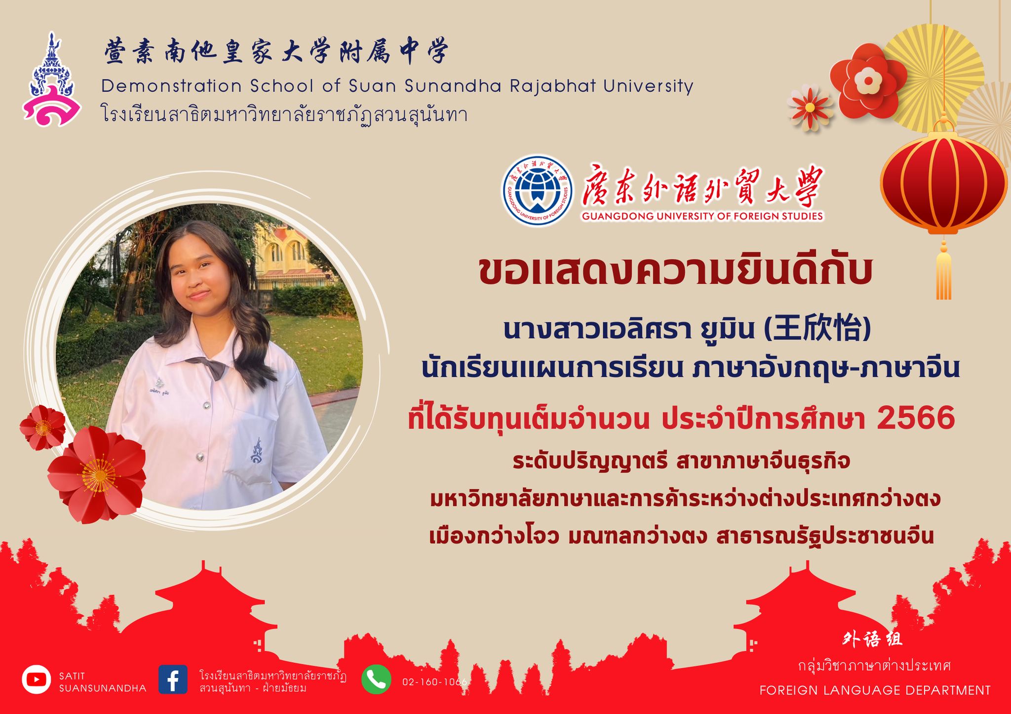 คว้าทุนจีนเต็มจำนวน 100% ตลอด 4 ปี ในระดับปริญญาตรี ณ มหาวิทยาลัยภาษาและการค้าต่างประเทศกว่างตง มณฑลกว่างโจว สาธารณรัฐประชาชนจีน